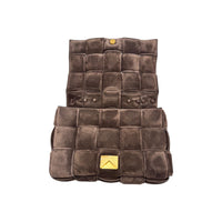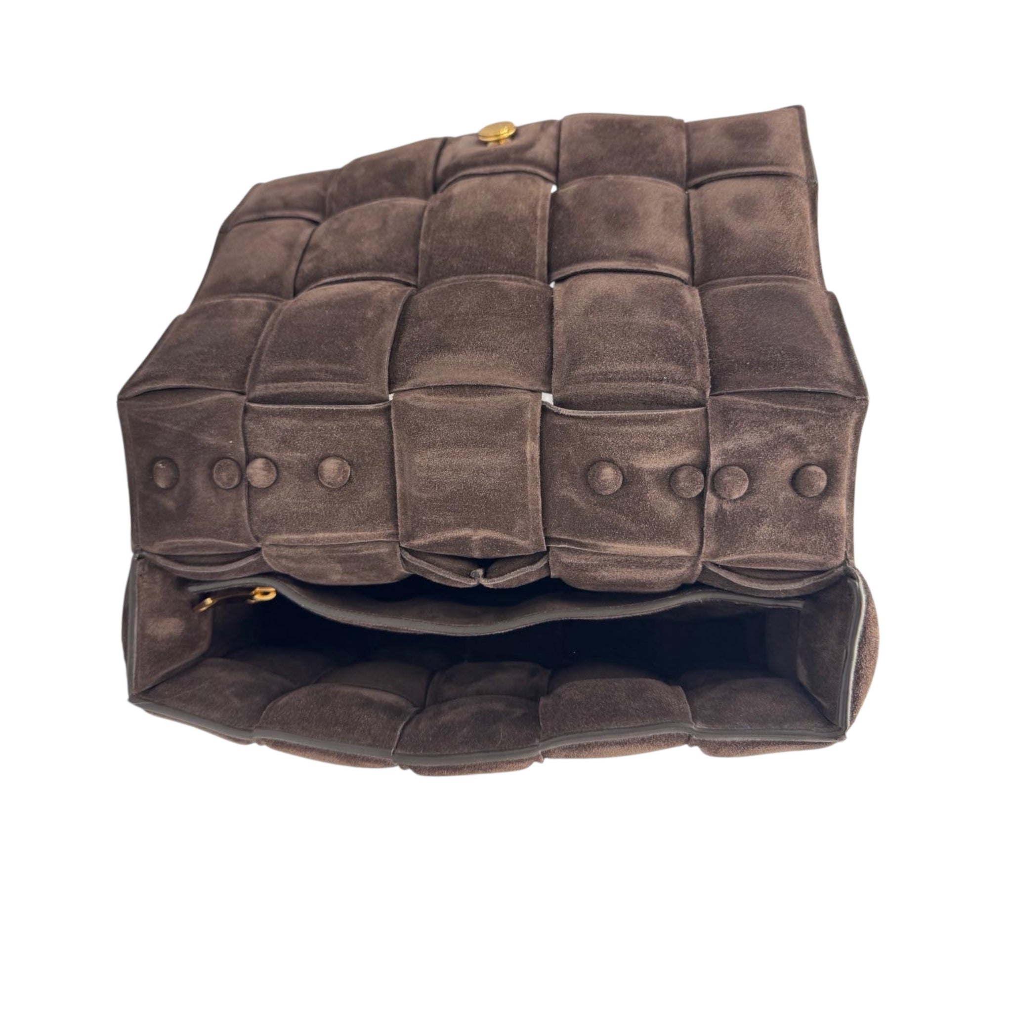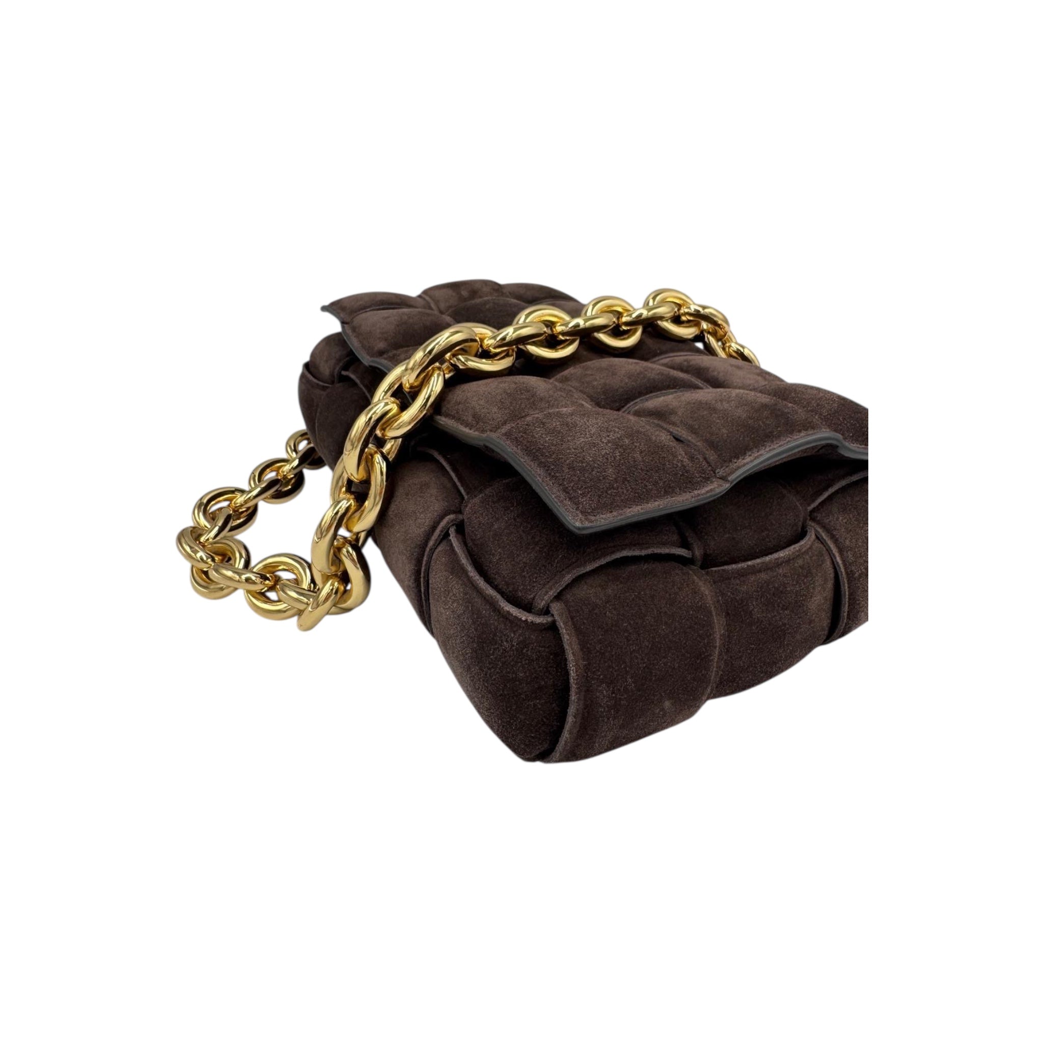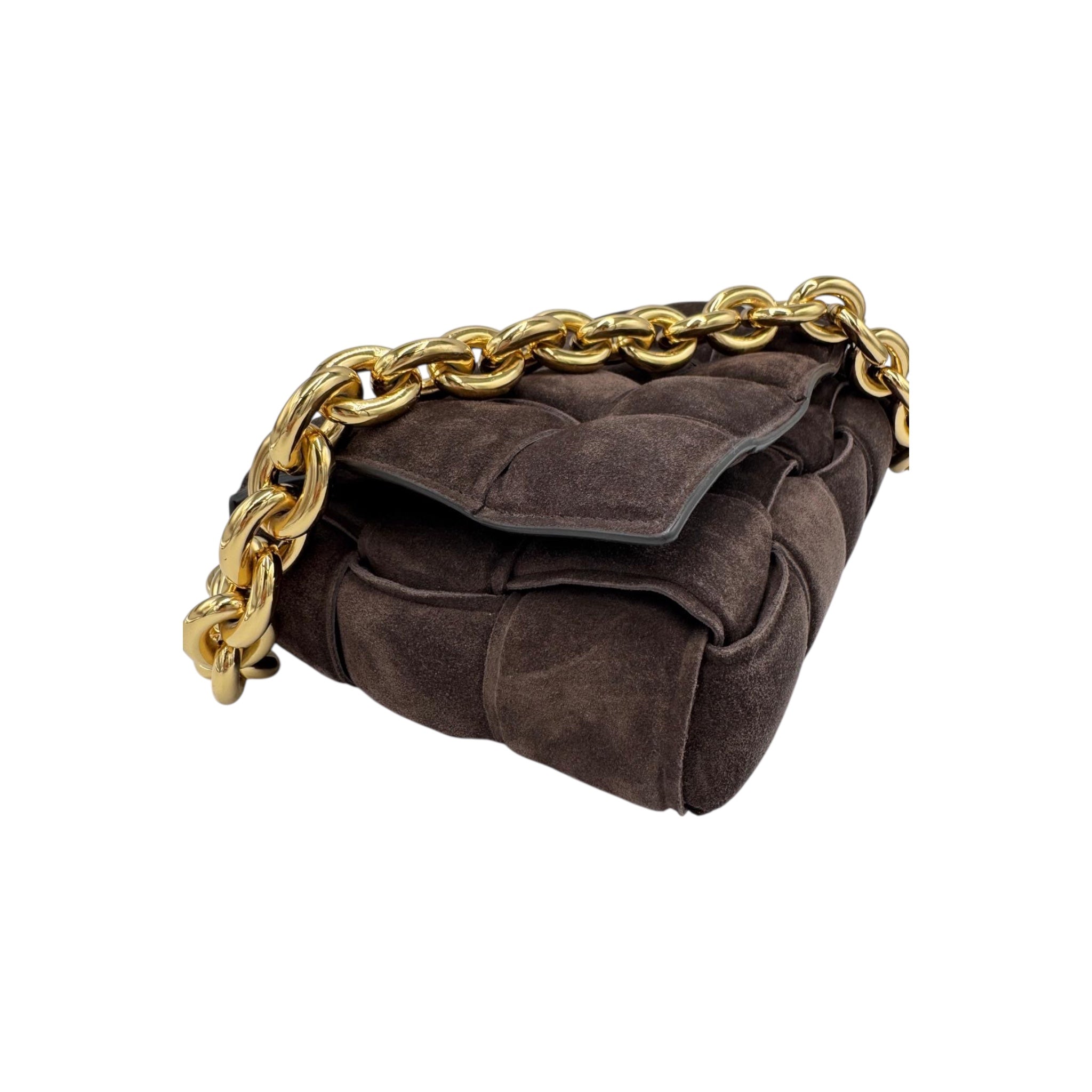 The stylish Bottega Venetta Chain Padded Cassette features a brown velvet body, a chain handle and shoulder strap, a flap with snap closure, an interior zip compartment and slip pockets.