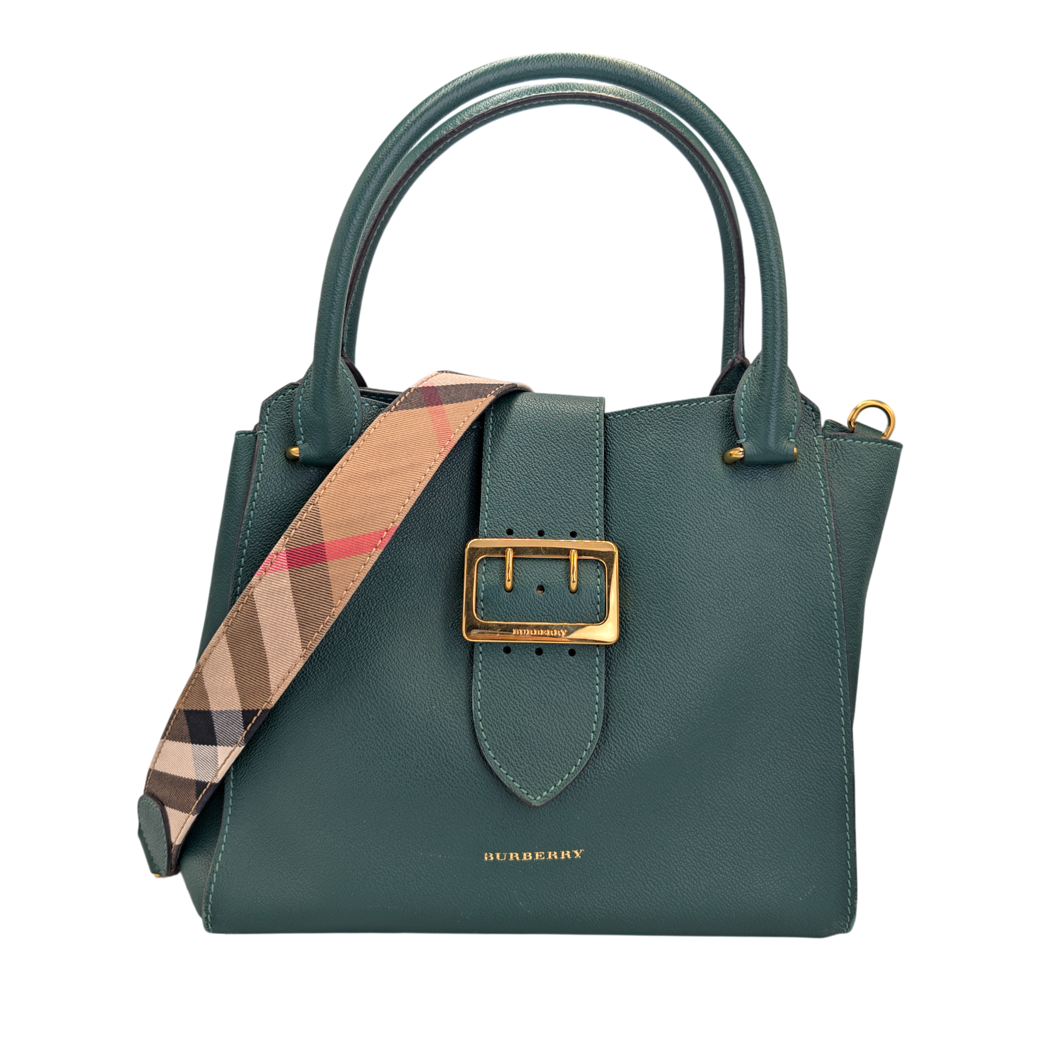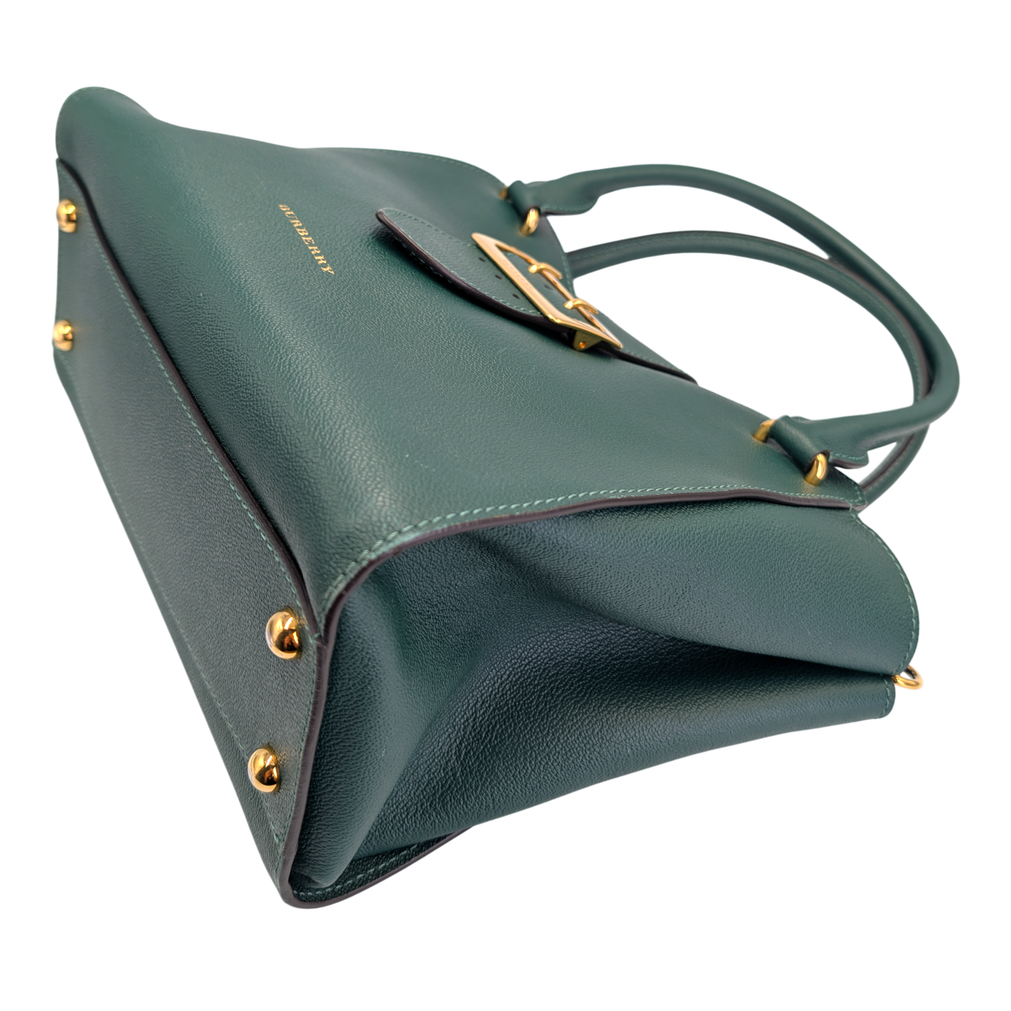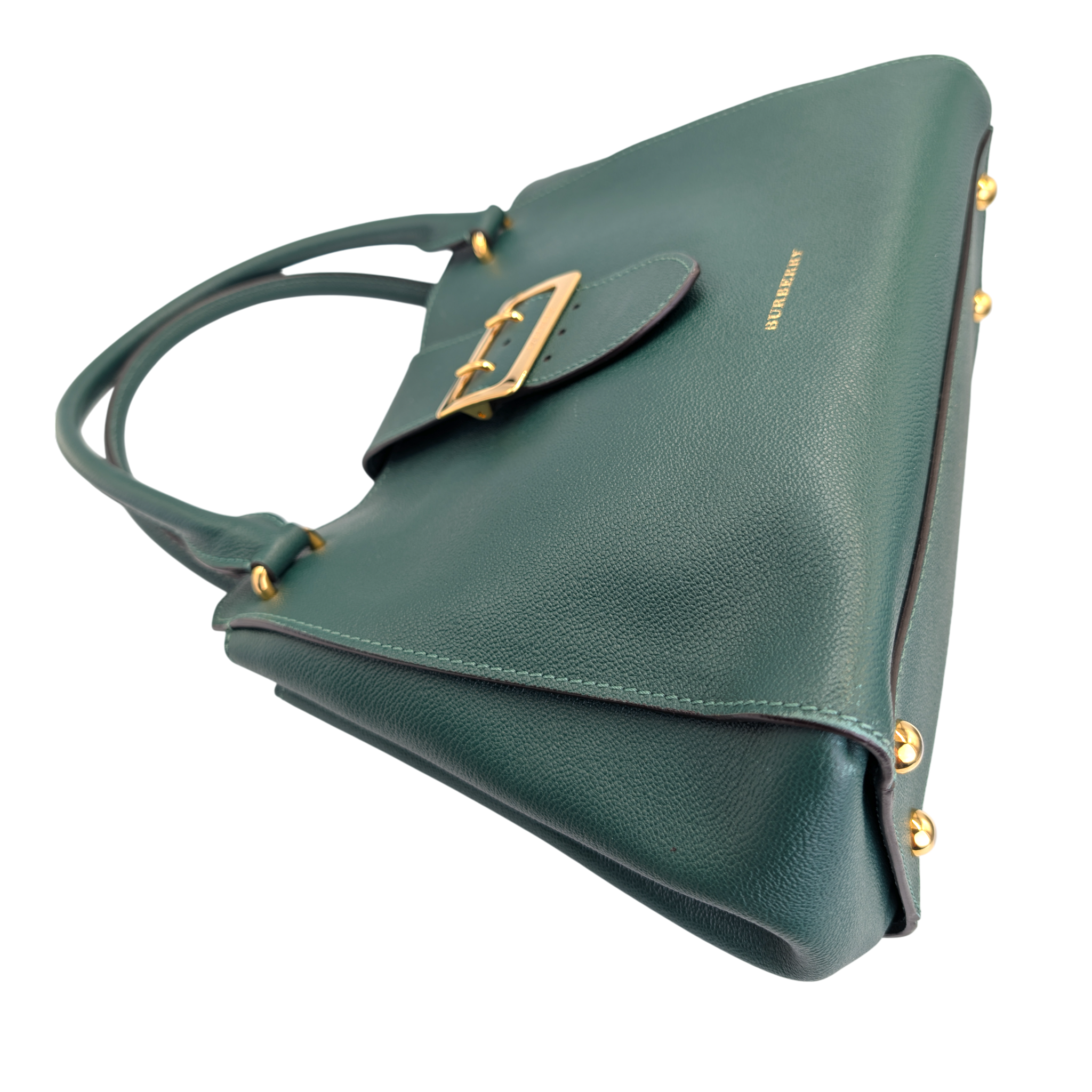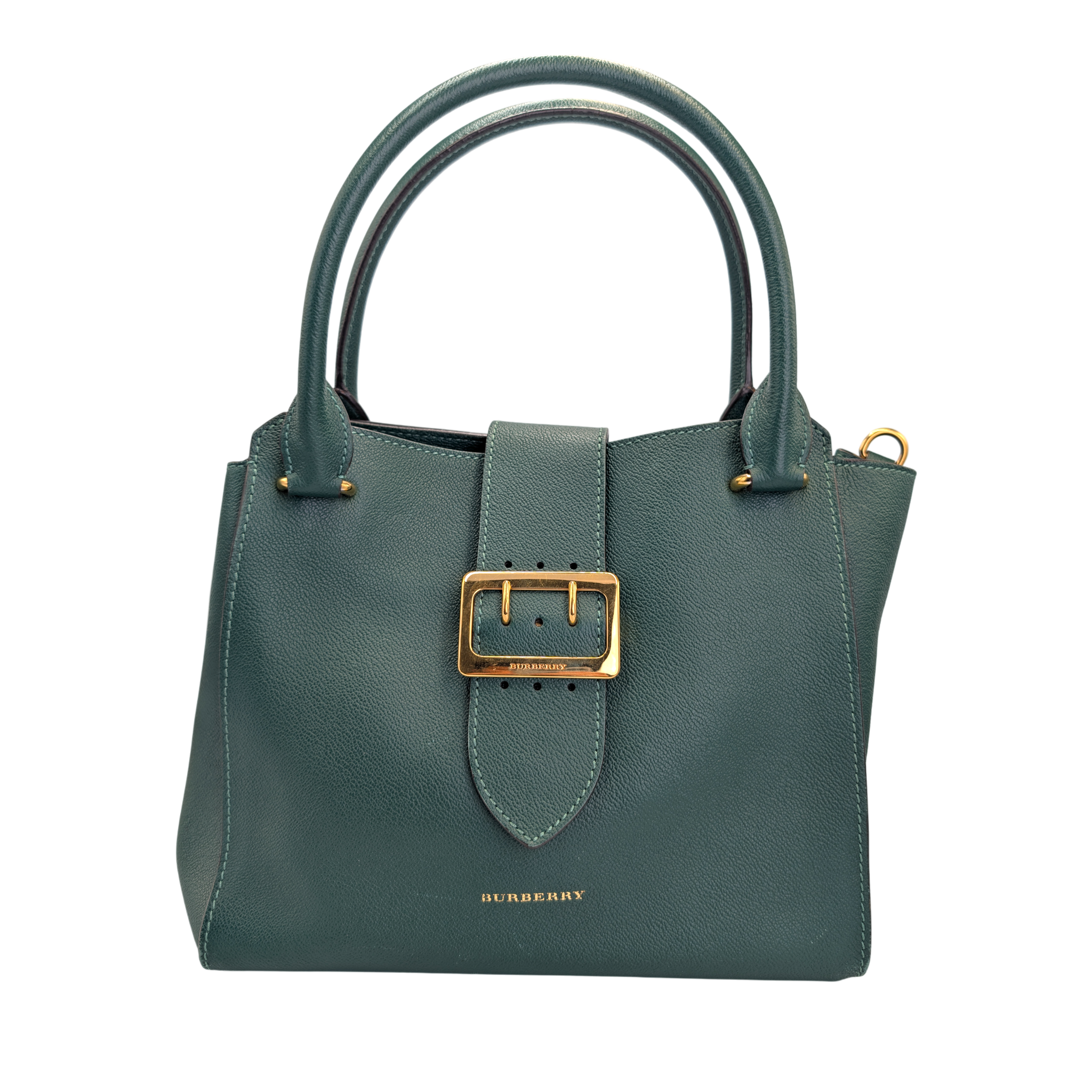 This elegant Burberry The Medium Buckle Tote impresses with its timeless design and high-quality workmanship. Made from green leather, combines the Bag clean lines with classic Burberry details like the distinctive buckle on the front. The structured shape makes it a versatile companion for everyday life and business.