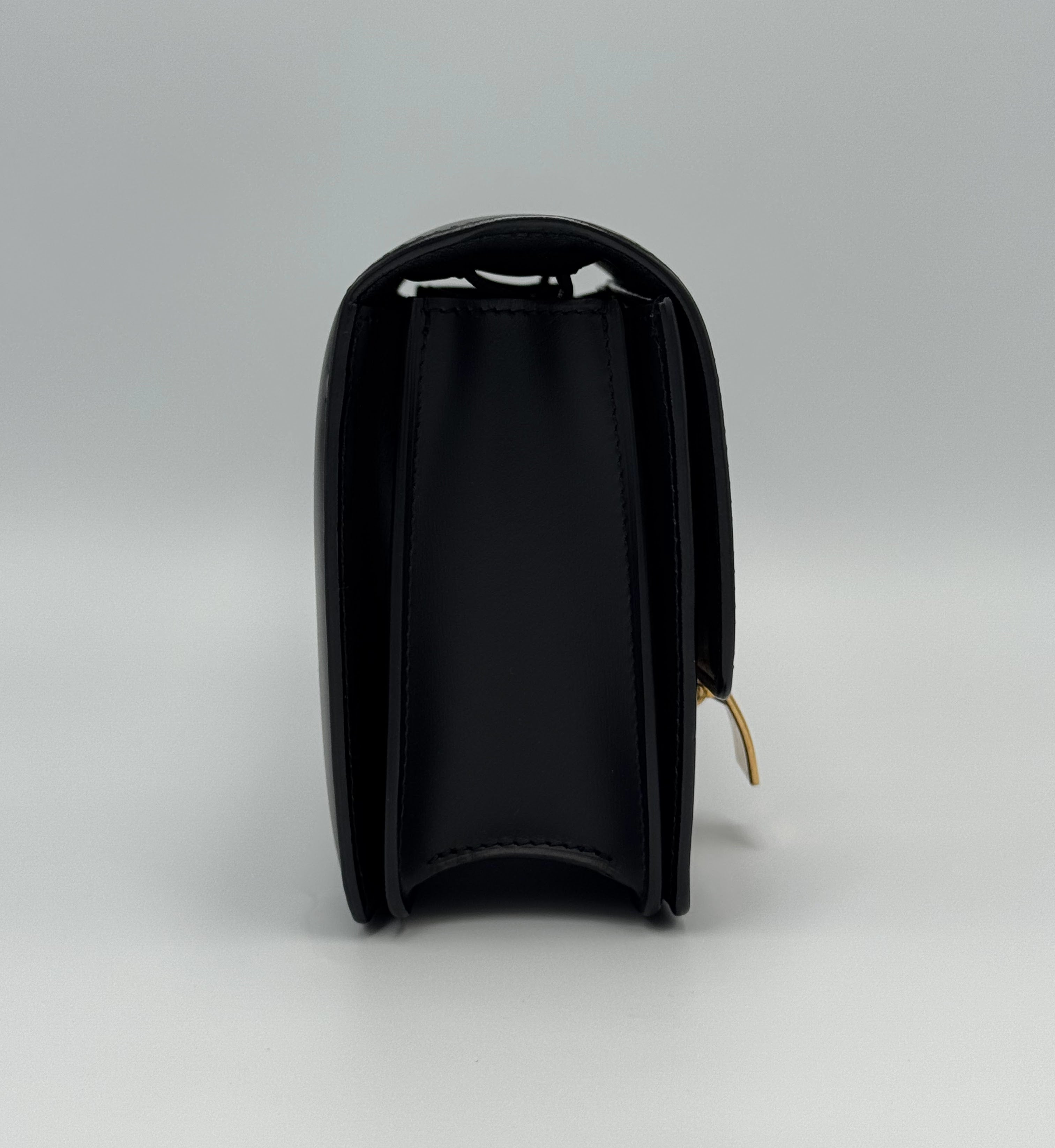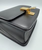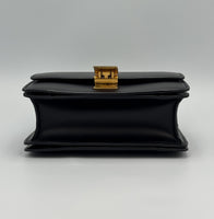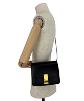 This Celine Classic Box Crossbody Bag in size Small is made of red leather and has matte gold-colored details. The bags in the series have a large fan base with their classic shape and distinctive snap closure. The Bag has a zipper compartment and slip pockets inside. The Bag is best worn across the body with a leather shoulder strap. One of the most popular bags in the house.