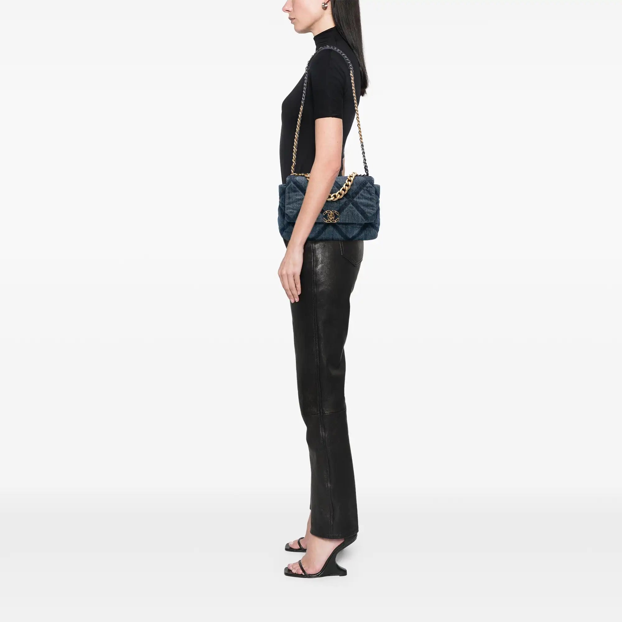 The Chanel 19 Flap Bag Large thrilled with one quilted denim design, a striking one Chain handle and one braided leather straps to be carried over the shoulder. The Flap with iconic CC twist lock, the practical external compartment as well as one Inner compartment with zip combine style and functionality at the highest level.