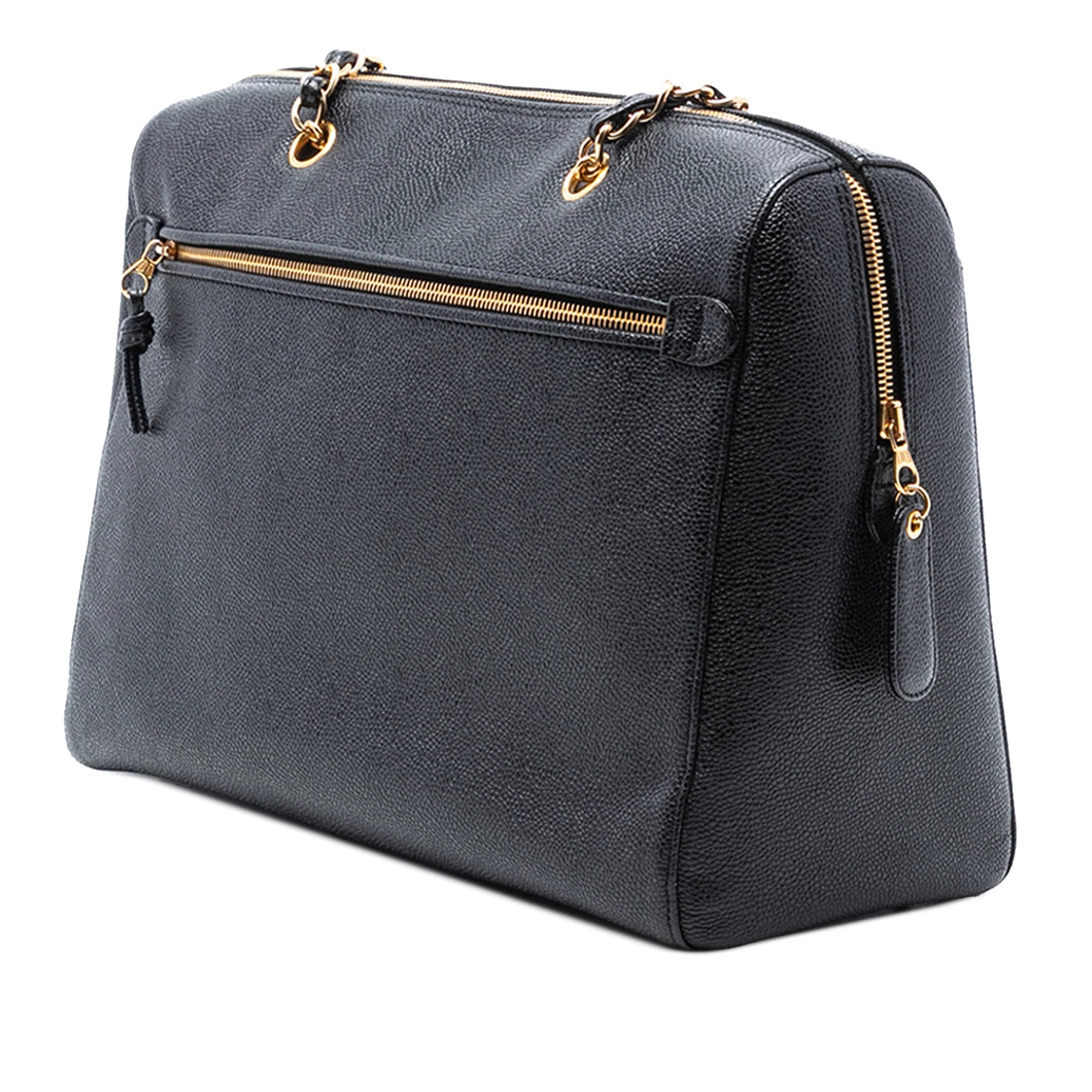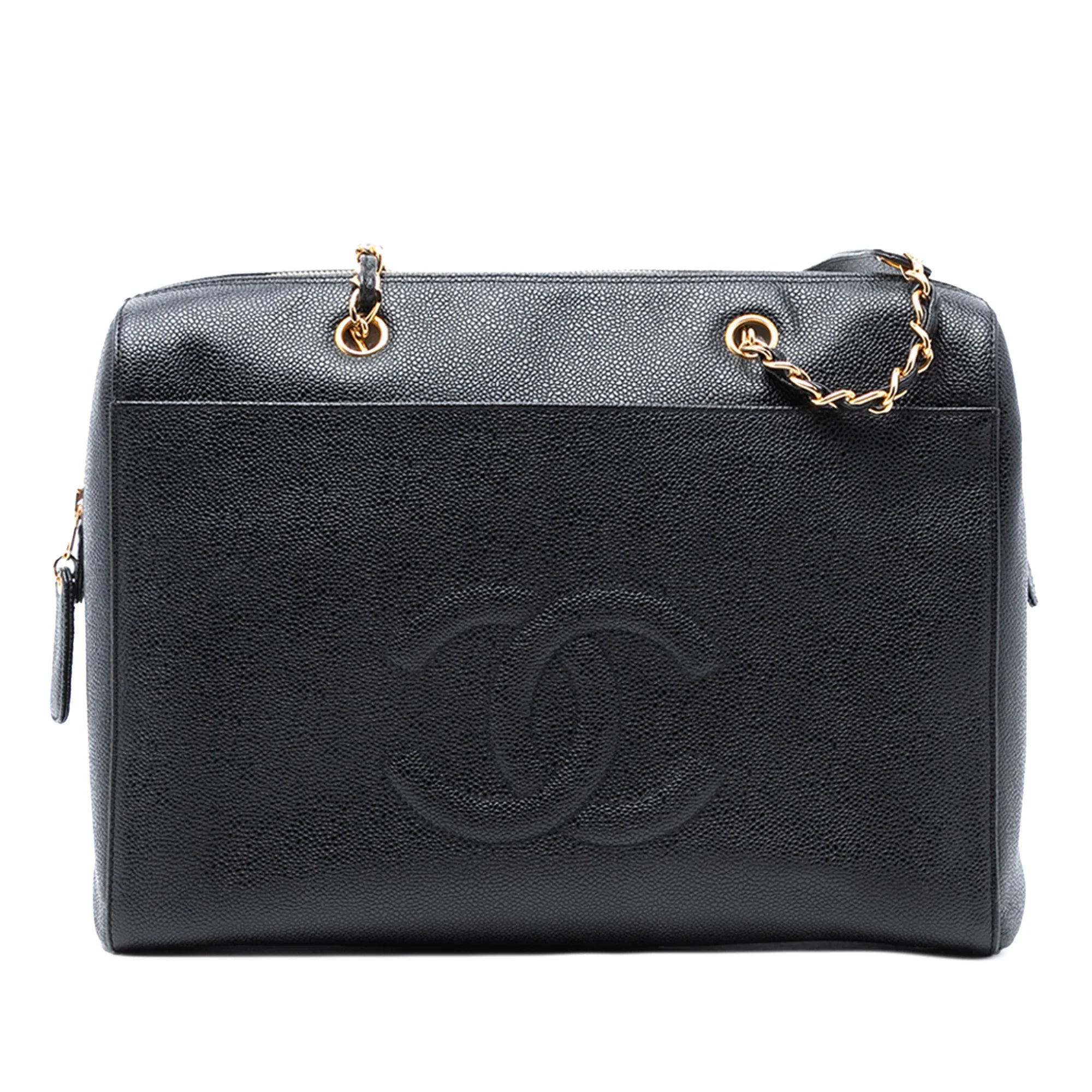 Ready for every day! This ingenious Chanel CC shoulder bag was made from Chanel's finely textured Caviar Leather made in a black version. The Bag has CC quilting on the front, gold details, a shoulder strap with gold chain elements and continuous leather straps, a gold zipper with a Tag at the top opening and a zippered compartment in the interior. The Bag is best worn over the shoulder.