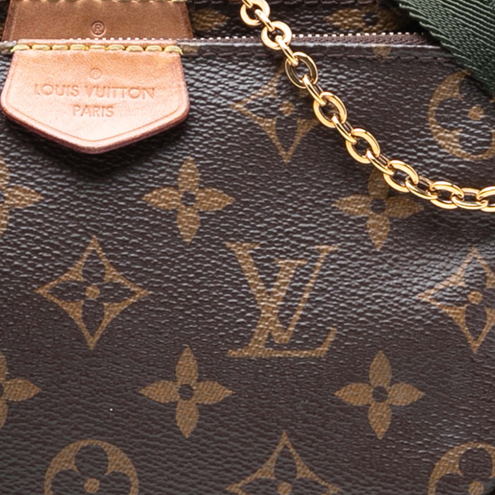 The Louis Vuitton Multi Pochette Accessories is a hybrid crossbodyBag with several pockets and compartments that combines a Pochette Accessories, a Mini Pochette Accessories and a round coin purse. Crafted from the iconic Monogram canvas with a mini monogram pattern on the sides of both pouches, it features a detachable gold-tone chain and an adjustable green Louis Vuitton jacquard strap for multiple carrying options. Here you have everything in one Bag - almost perfection!