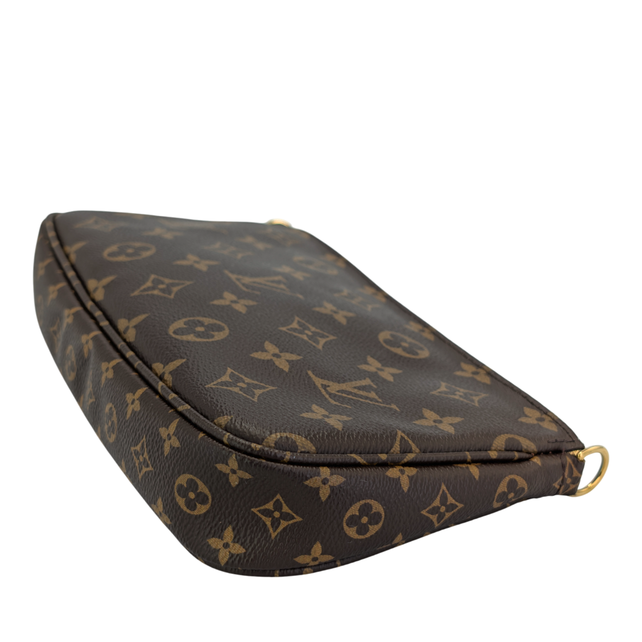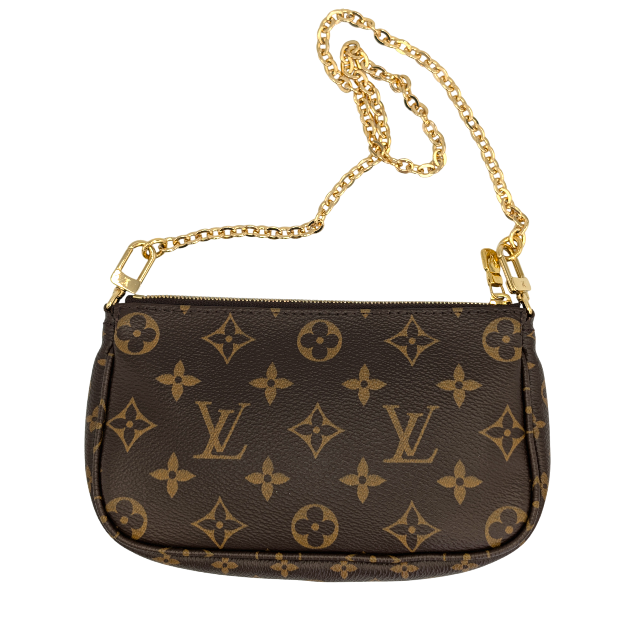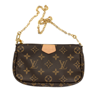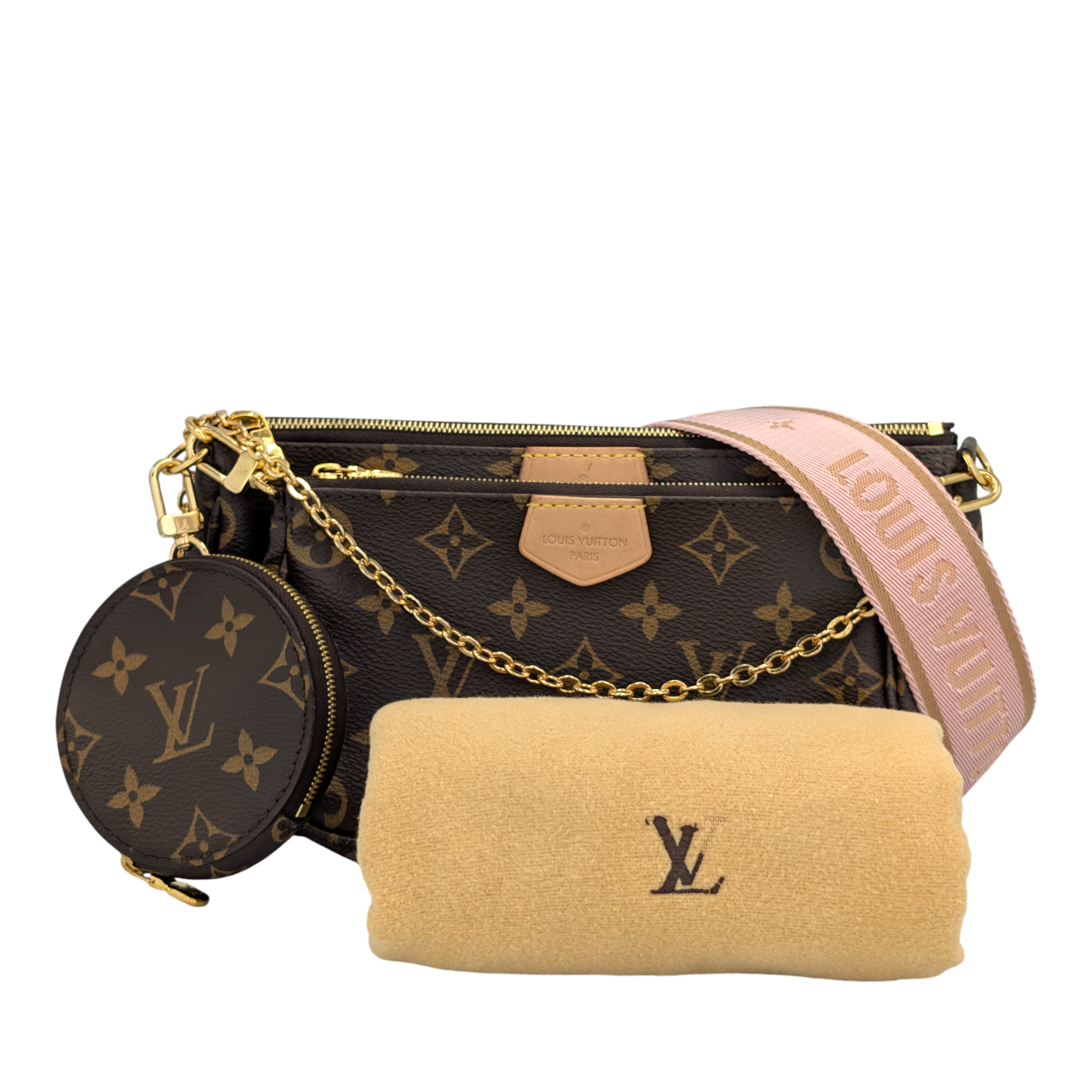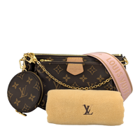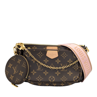 The Louis Vuitton Multi Pochette Accessories is one of those bags that makes you wonder how you ever managed without it. Three favorite pieces in one - a Pochette Accessories, a Mini Pochette and a round coin purse - all made from iconic Monogram canvas, perfectly combined. The wide jacquard strap in fine pink is not only an eye-catcher, but also incredibly practical: adjustable, removable and comfortable to wear. Add a gold-colored chain for an elegant evening appearance. Whether everyday life or going out - everything is just right here. And yes: you can fall in love with her a little.