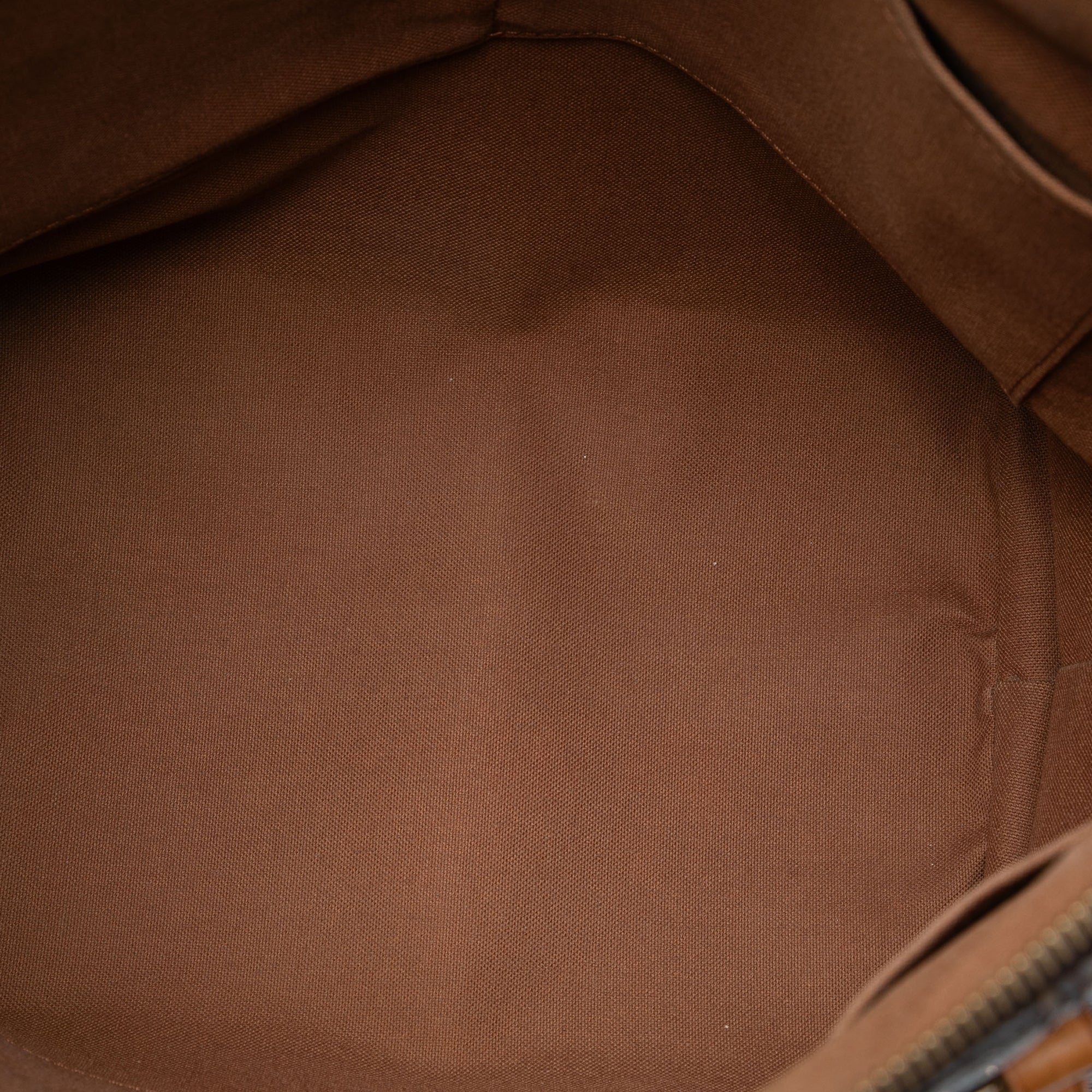 Condition: The outside is discolored, worn and partially water stained and discolored on the front and back, sides, handles and corners. Inside, both the lining and the inside pocket have a few stains. The hardware shows scratches.