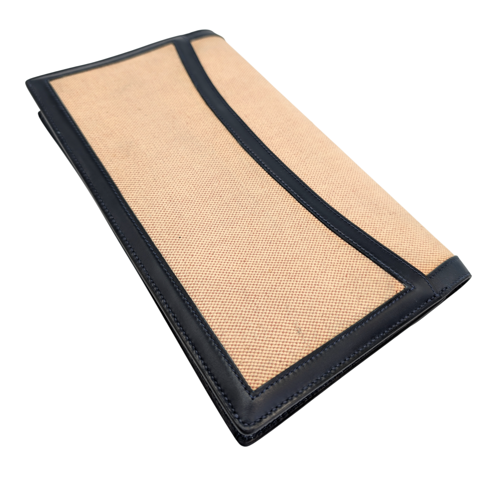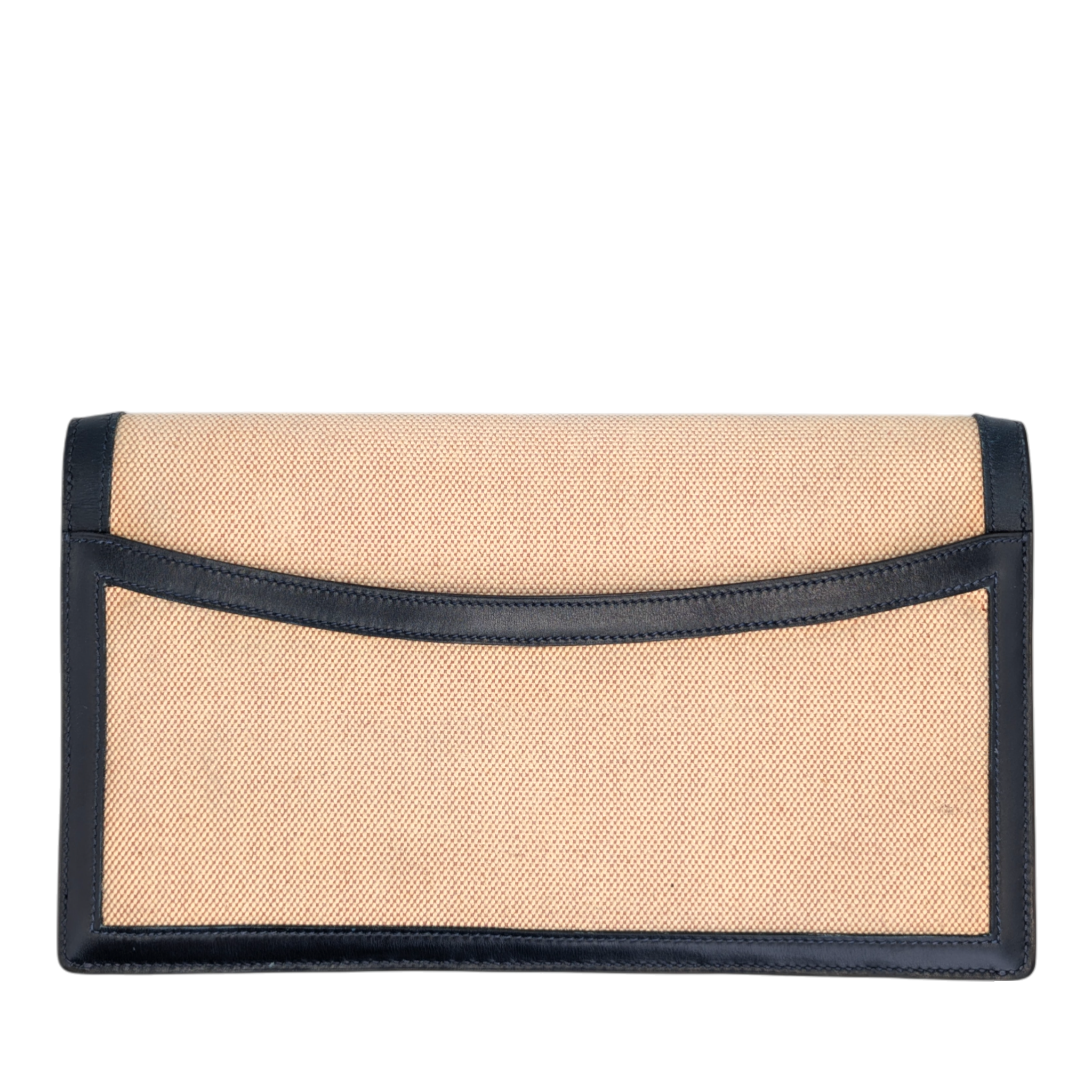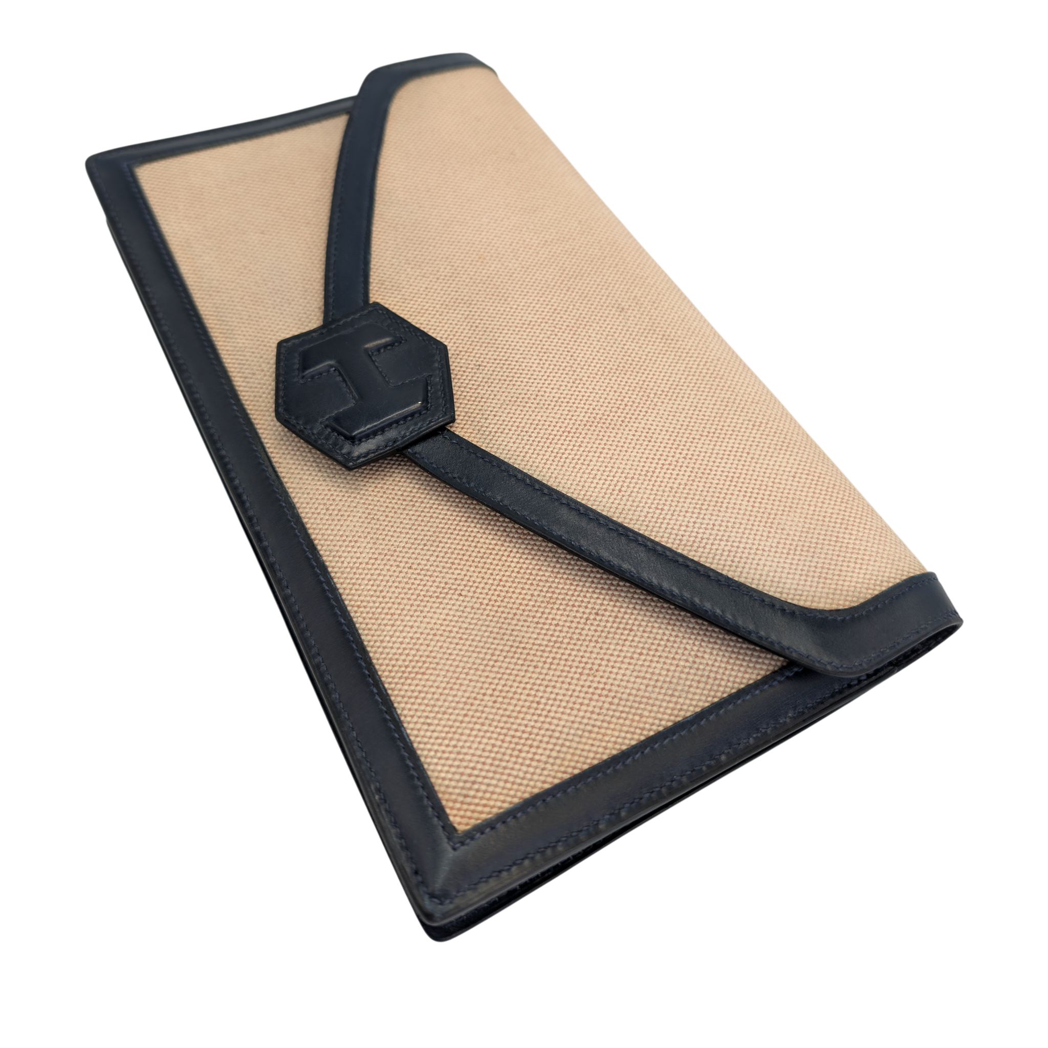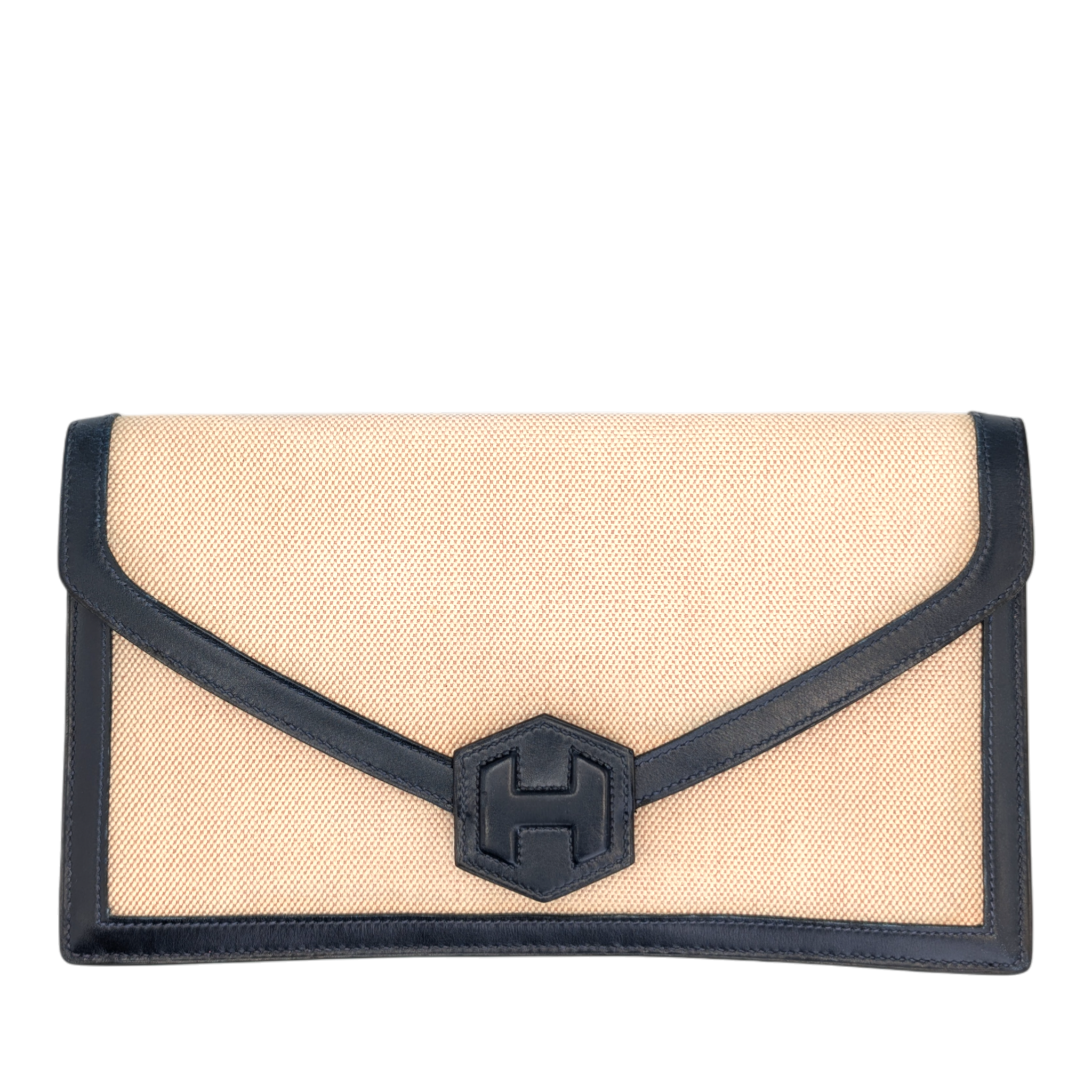 This elegant Hermes Constance clutch bag is a classic vintage model with a timeless design. The finely textured canvas in beige is framed by dark blue leather details and gives the clutch bag an understated, very elegant look. The characteristic envelope shape with the iconic Constance fastening makes it a stylish companion for day and evening.