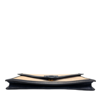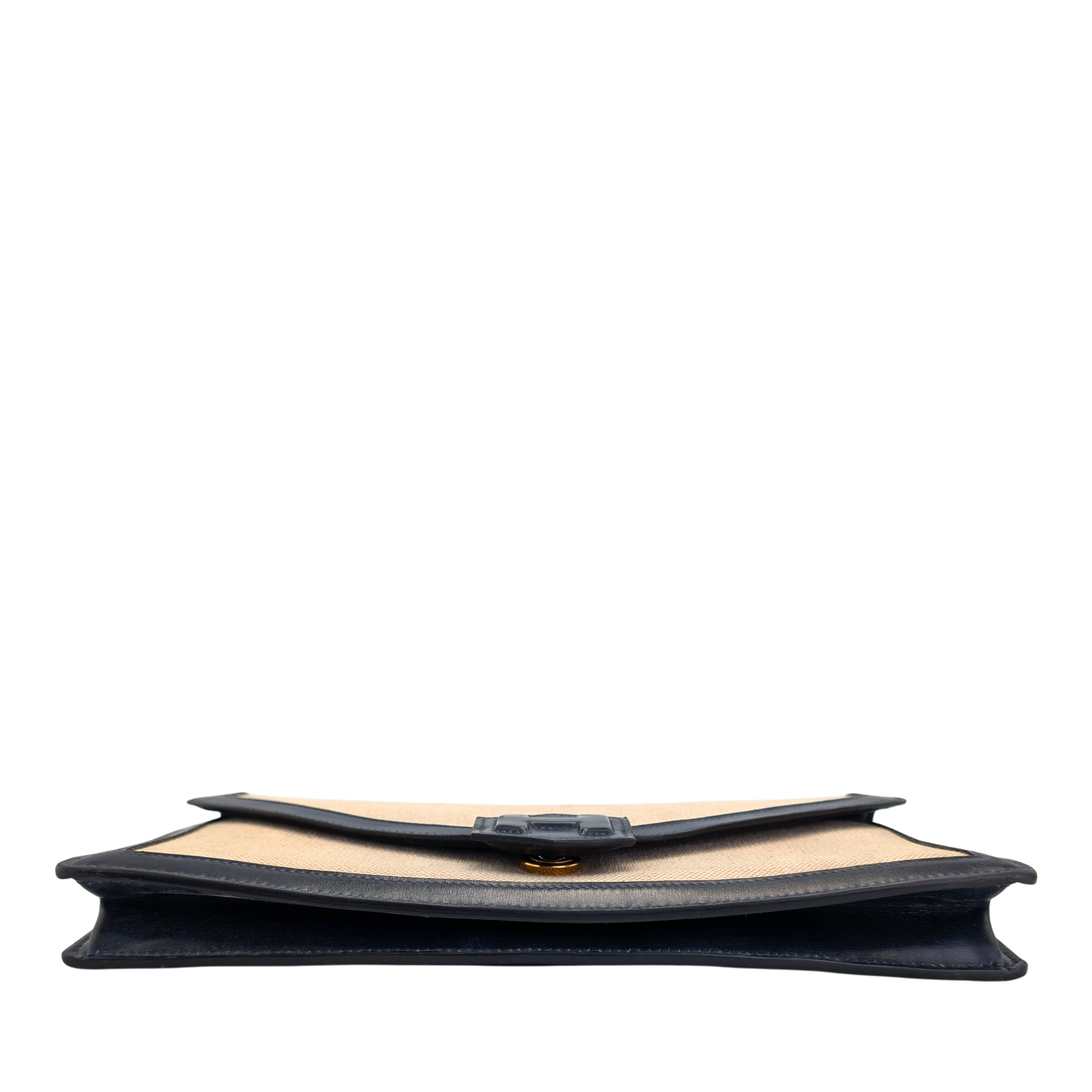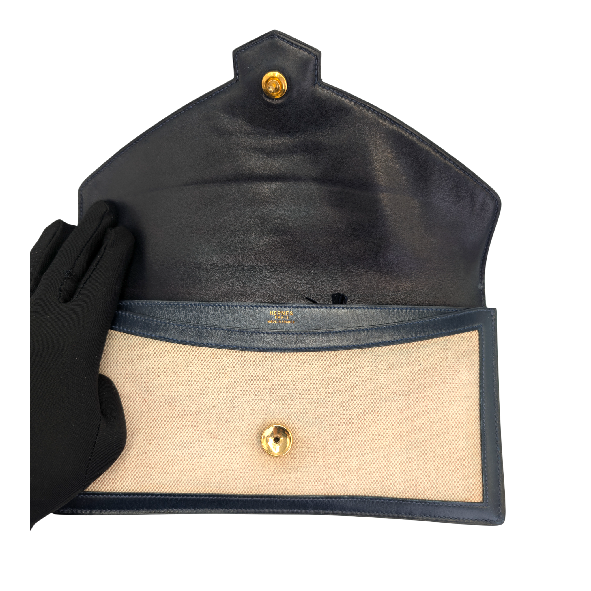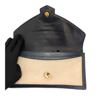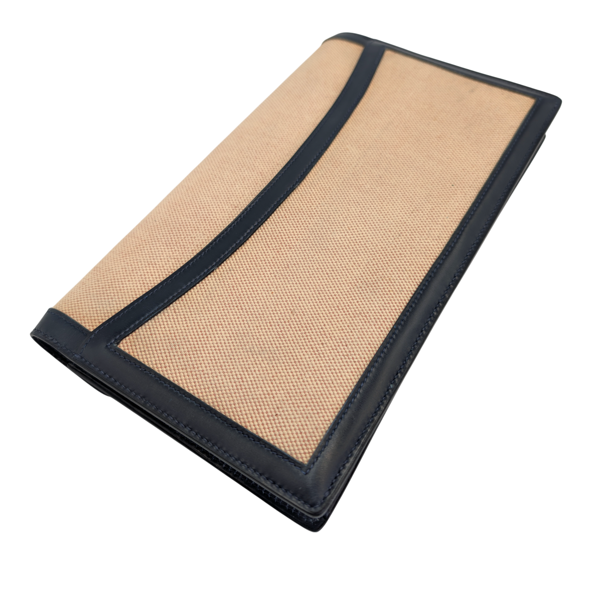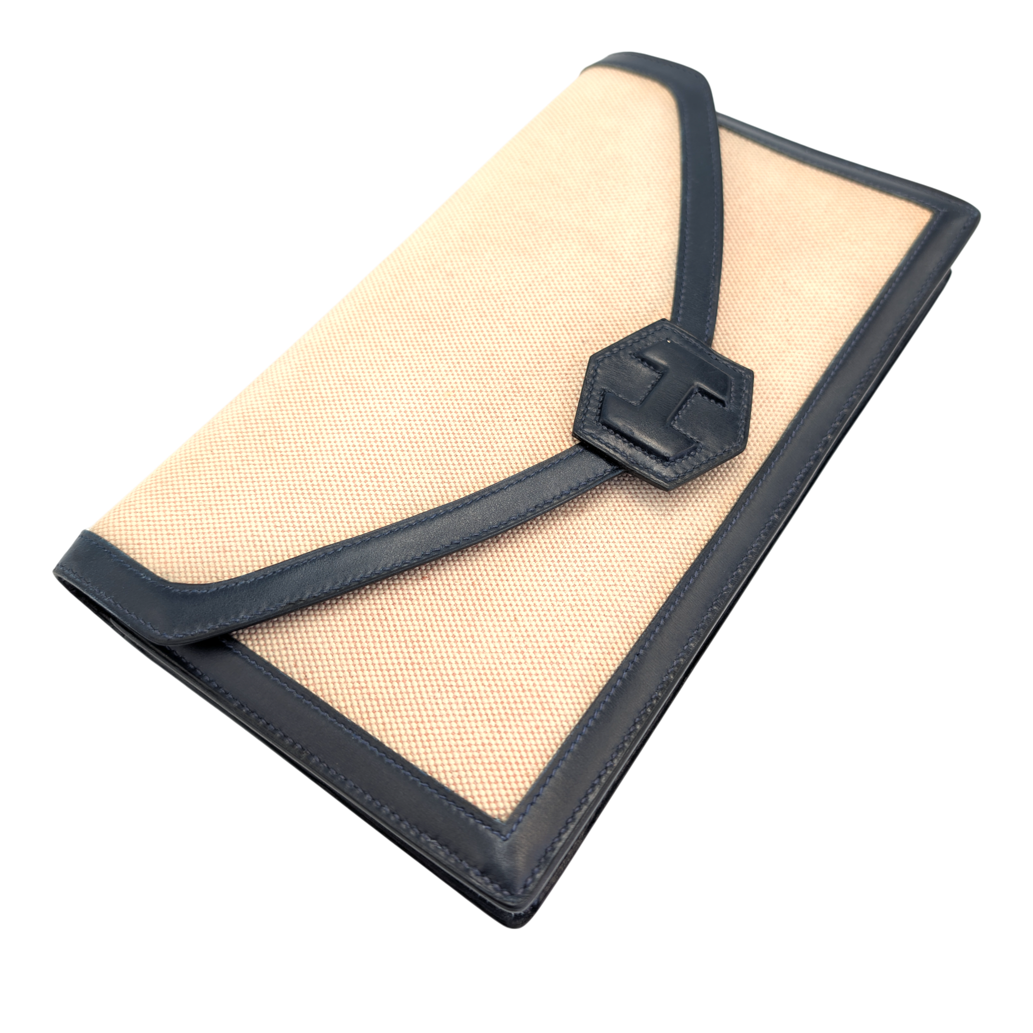 This elegant Hermes Constance clutch bag is a classic vintage model with a timeless design. The finely textured canvas in beige is framed by dark blue leather details and gives the clutch bag an understated, very elegant look. The characteristic envelope shape with the iconic Constance fastening makes it a stylish companion for day and evening.