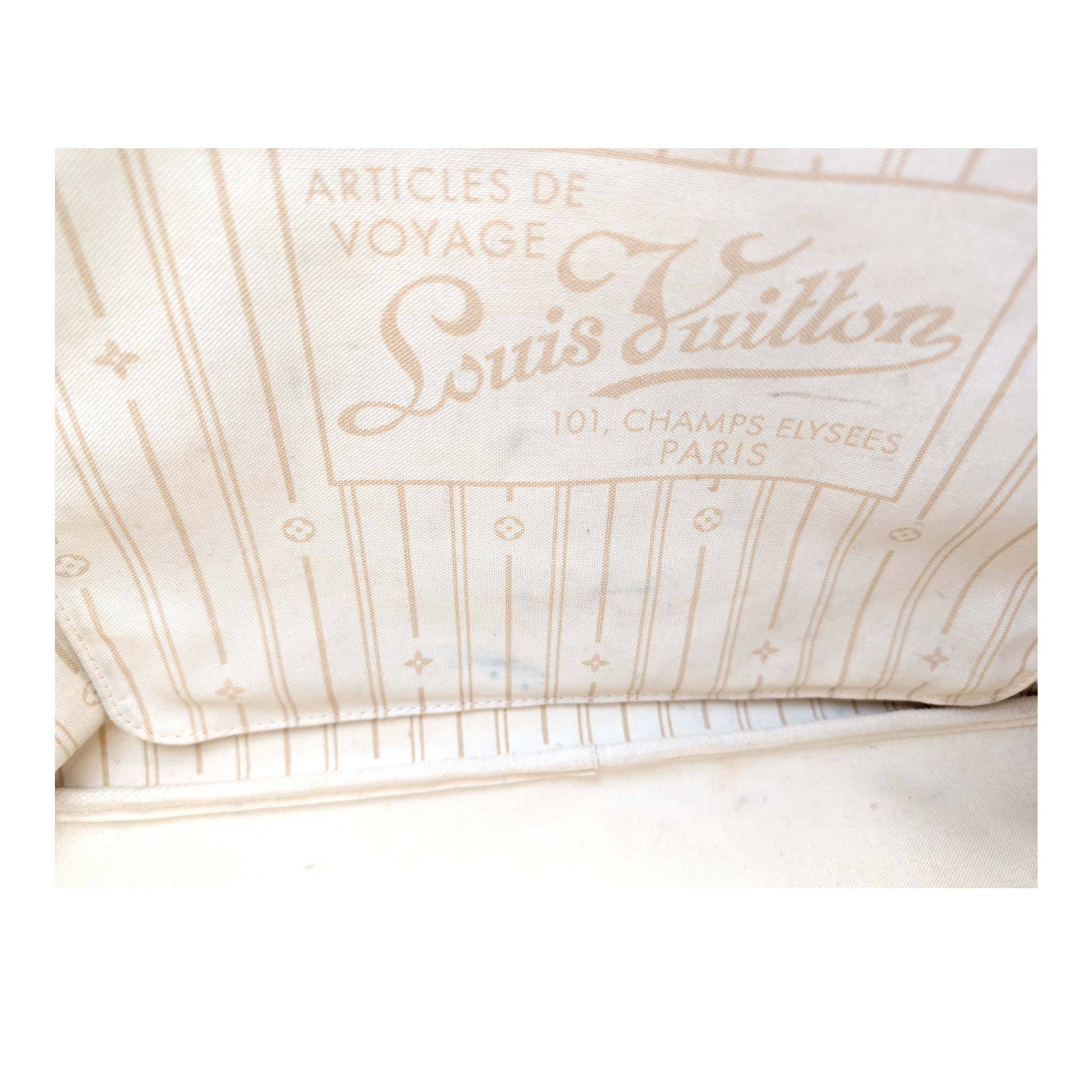 Condition: There are a few scratches, discolorations, wear and water stains on the leather trimmings. The corners are finely worn. You can see fine discoloration on the canvas. There are a few stains on the interior. The hardware has scratches.