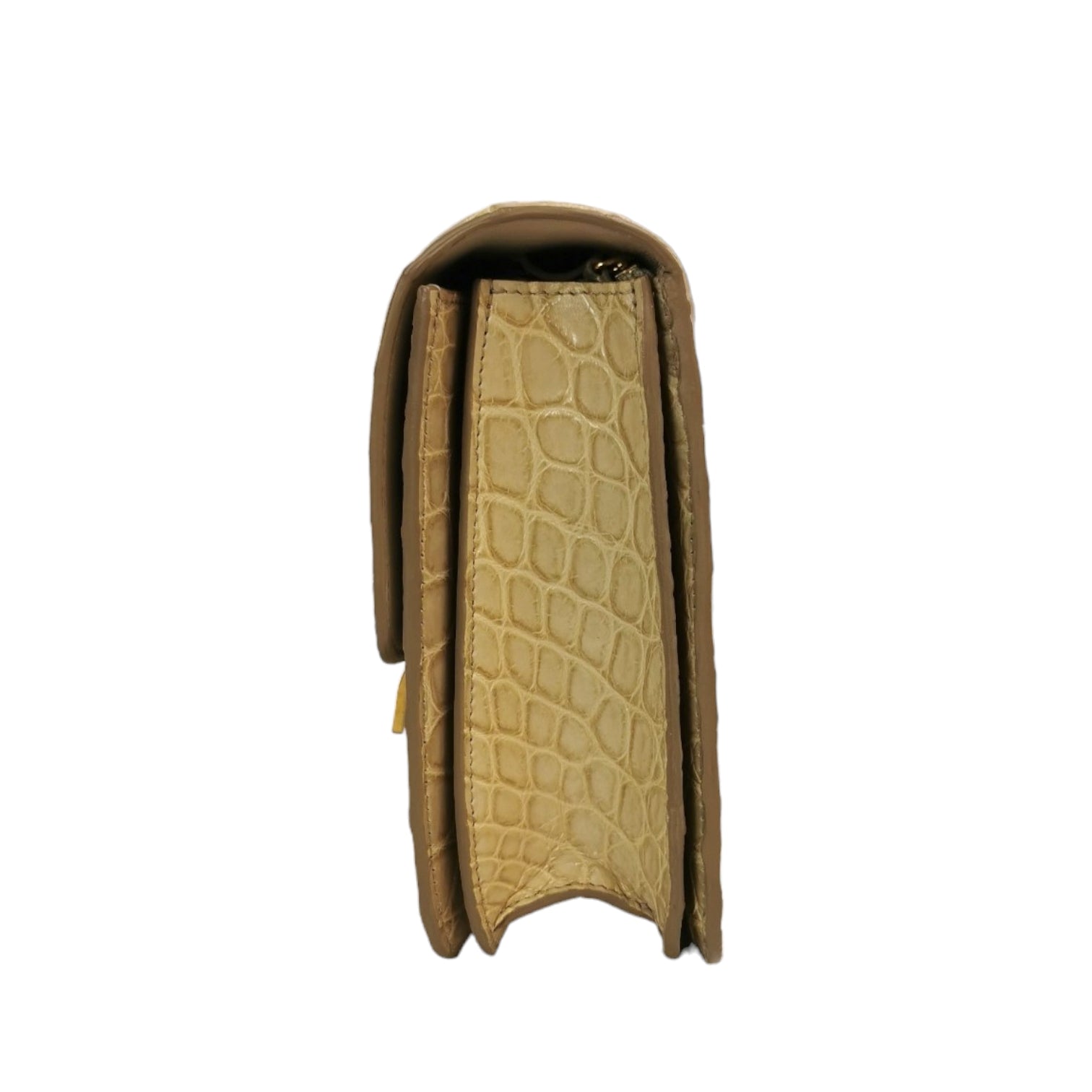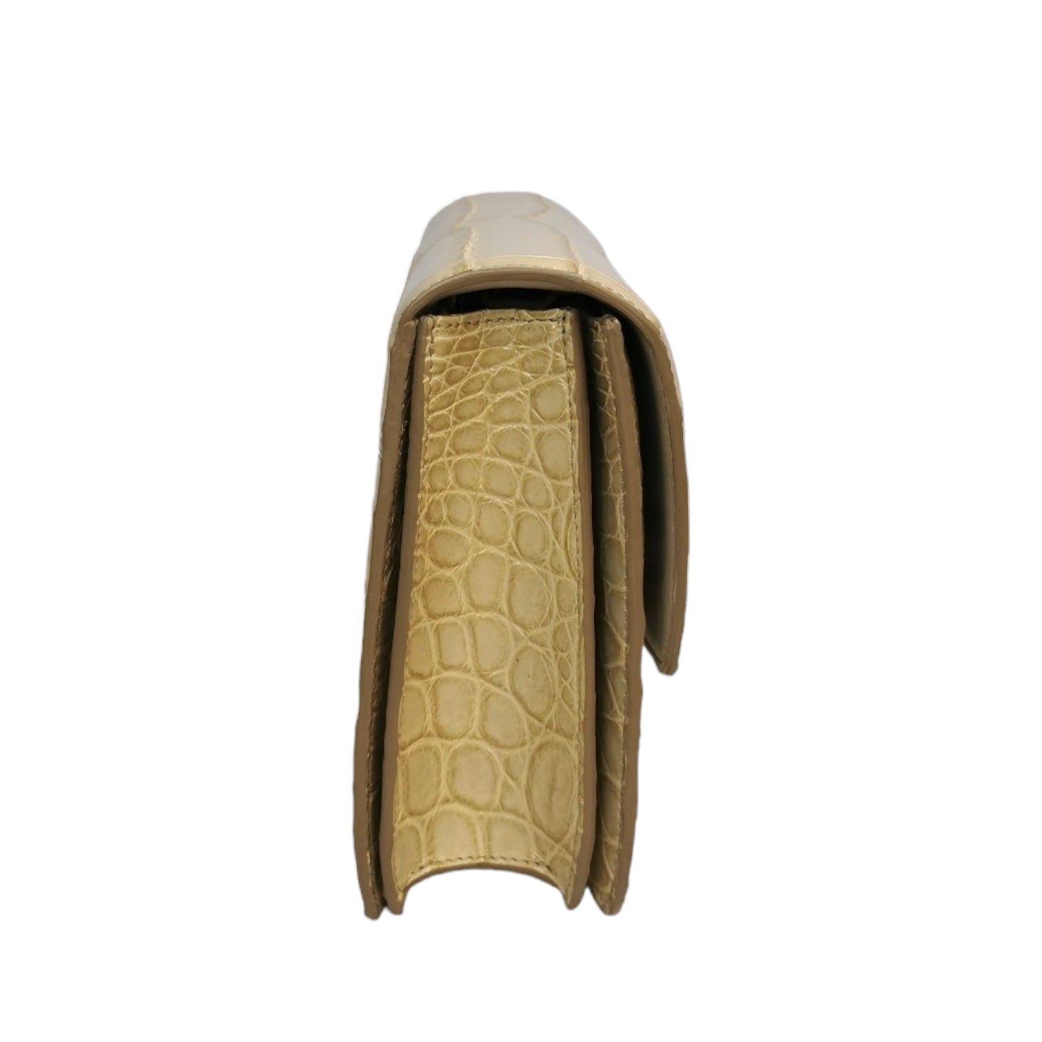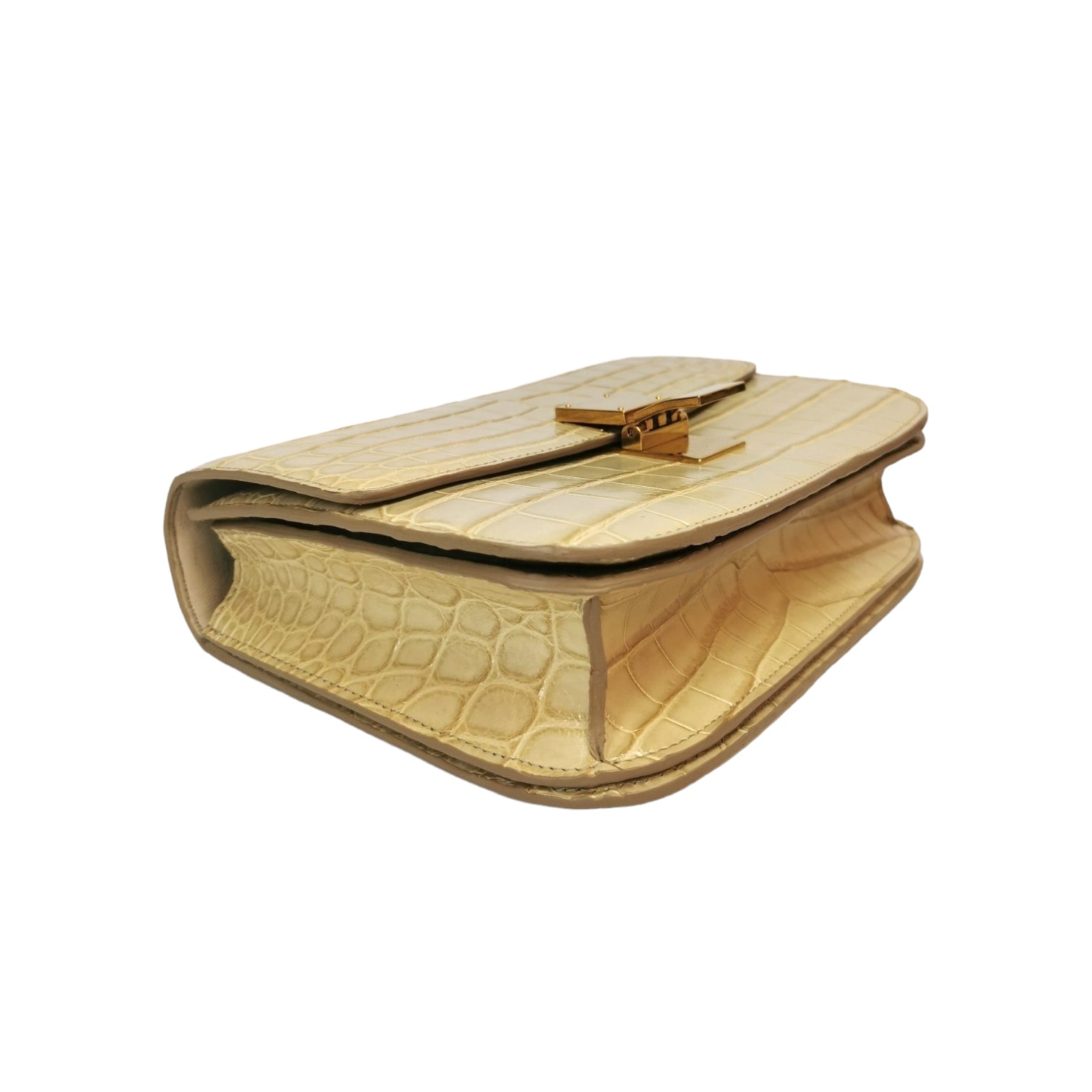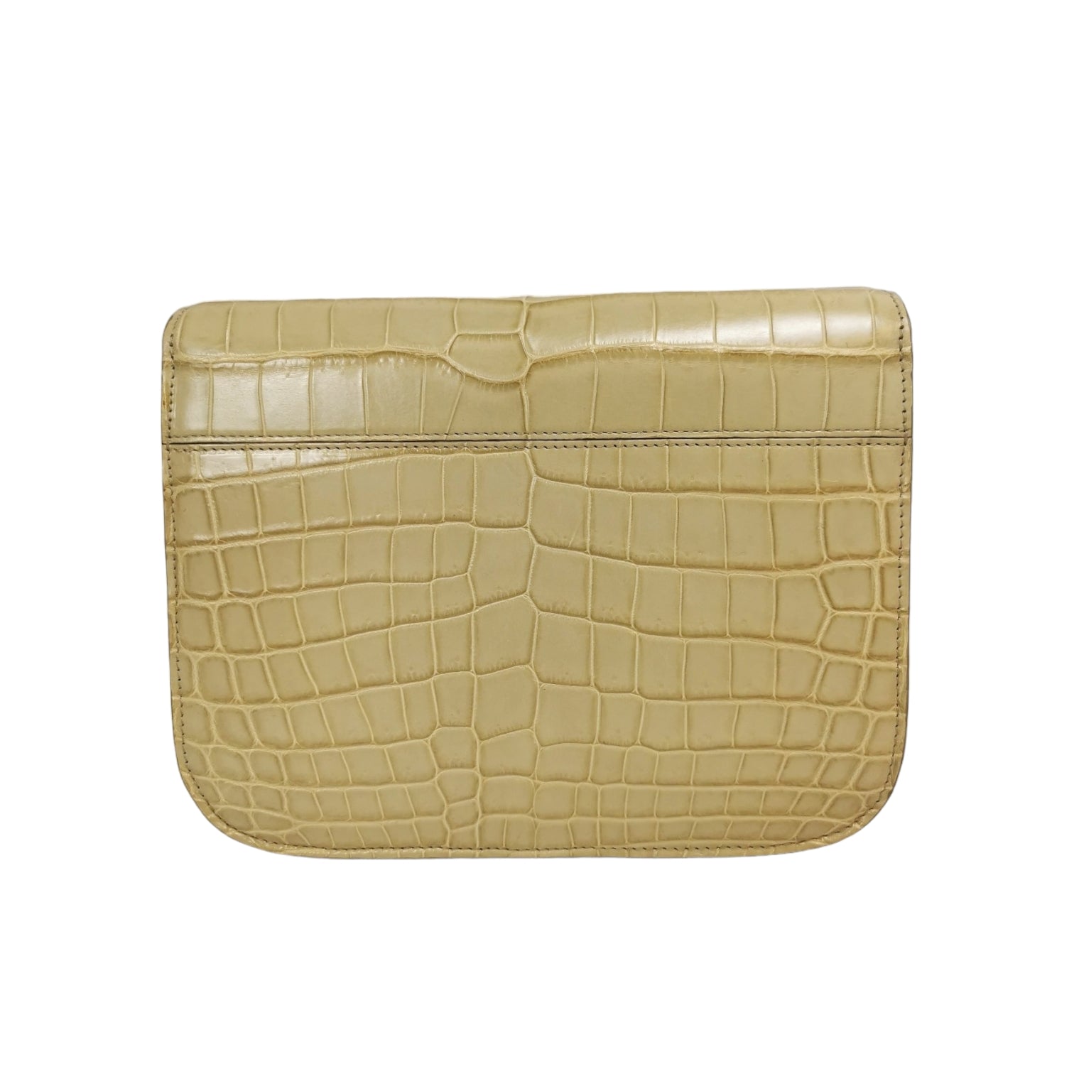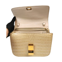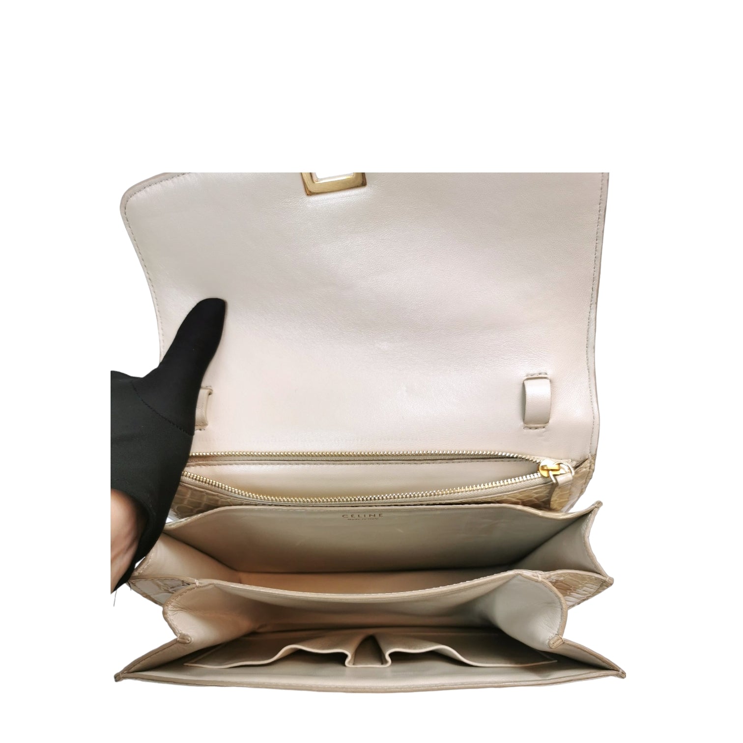 The Céline Classic Box is one of the most popular models from the traditional French company. This example is made of beige crocodile and has gold hardware. The Bag secured via a snap closure under the flap on the front. The interior is lined with the finest lamb leather and has two pockets and an additional zippered compartment. With him she can Bag Can be worn over the shoulder or crossbody.
