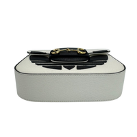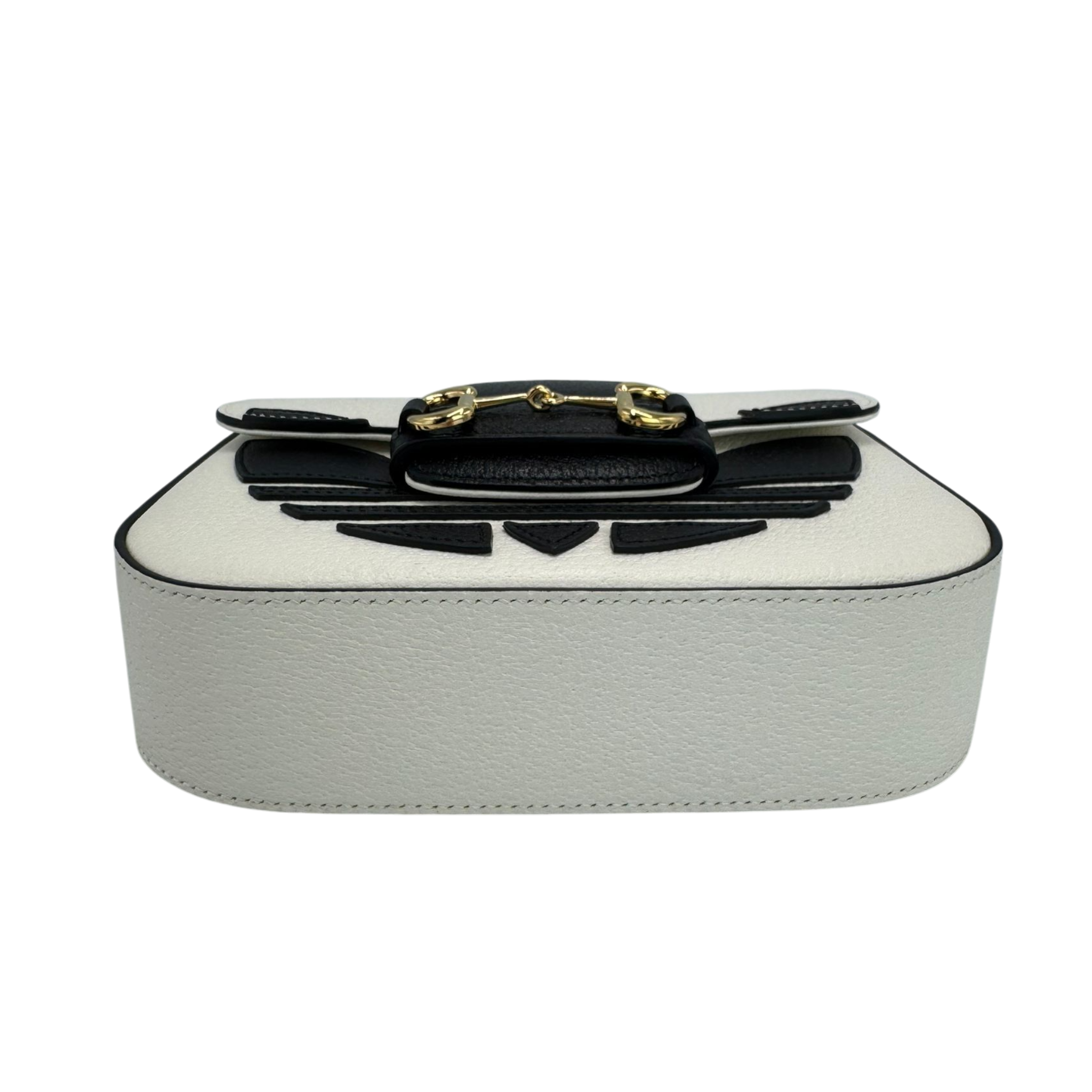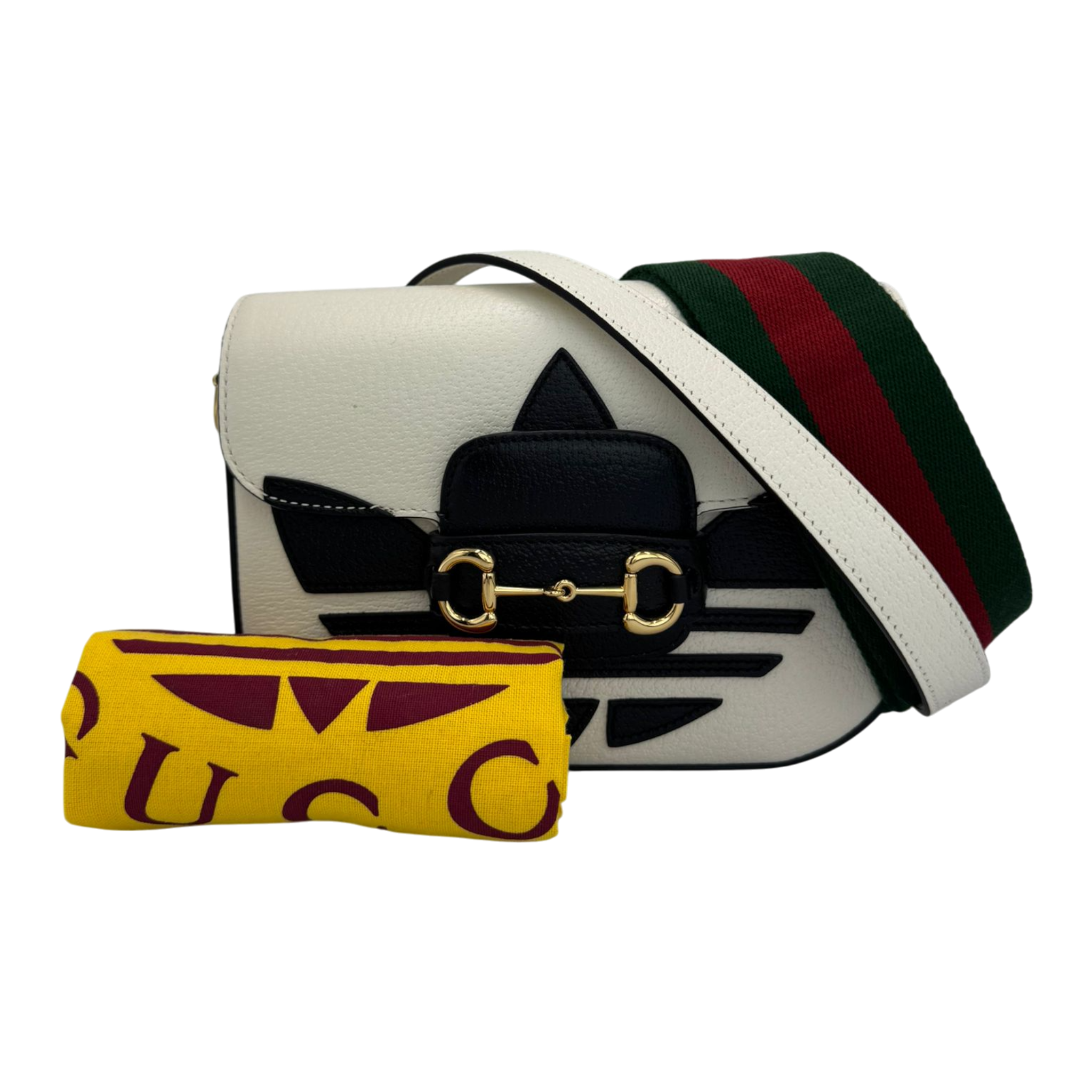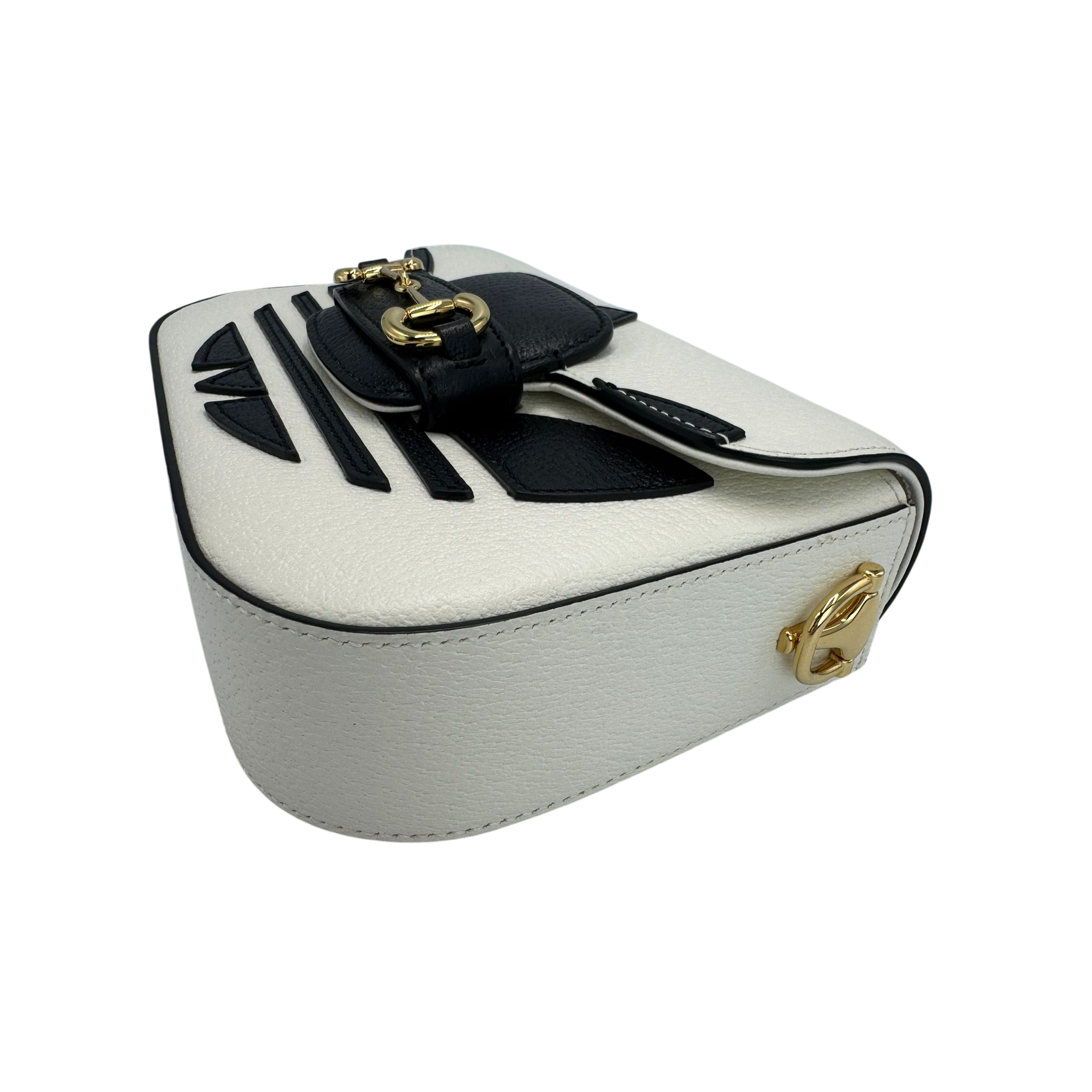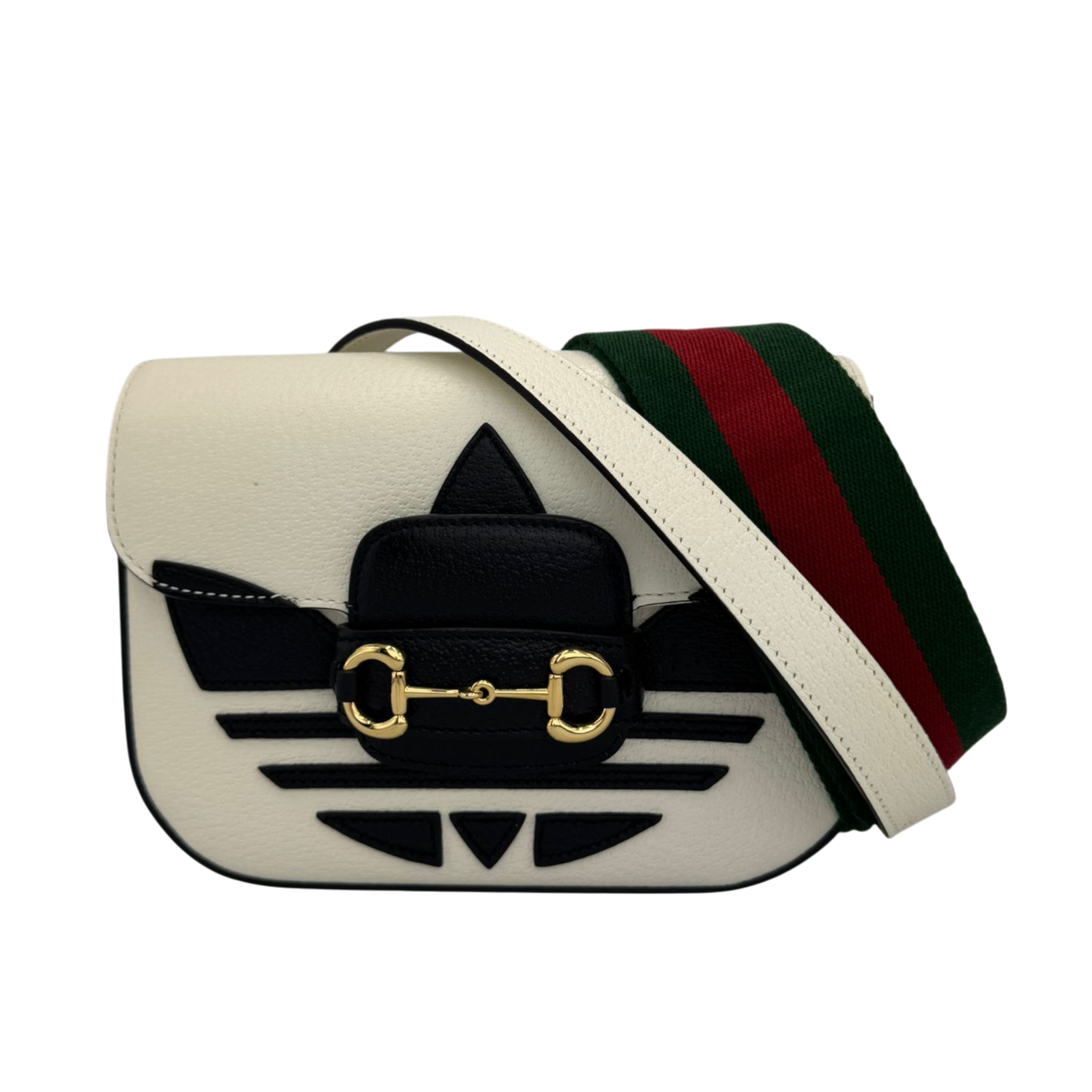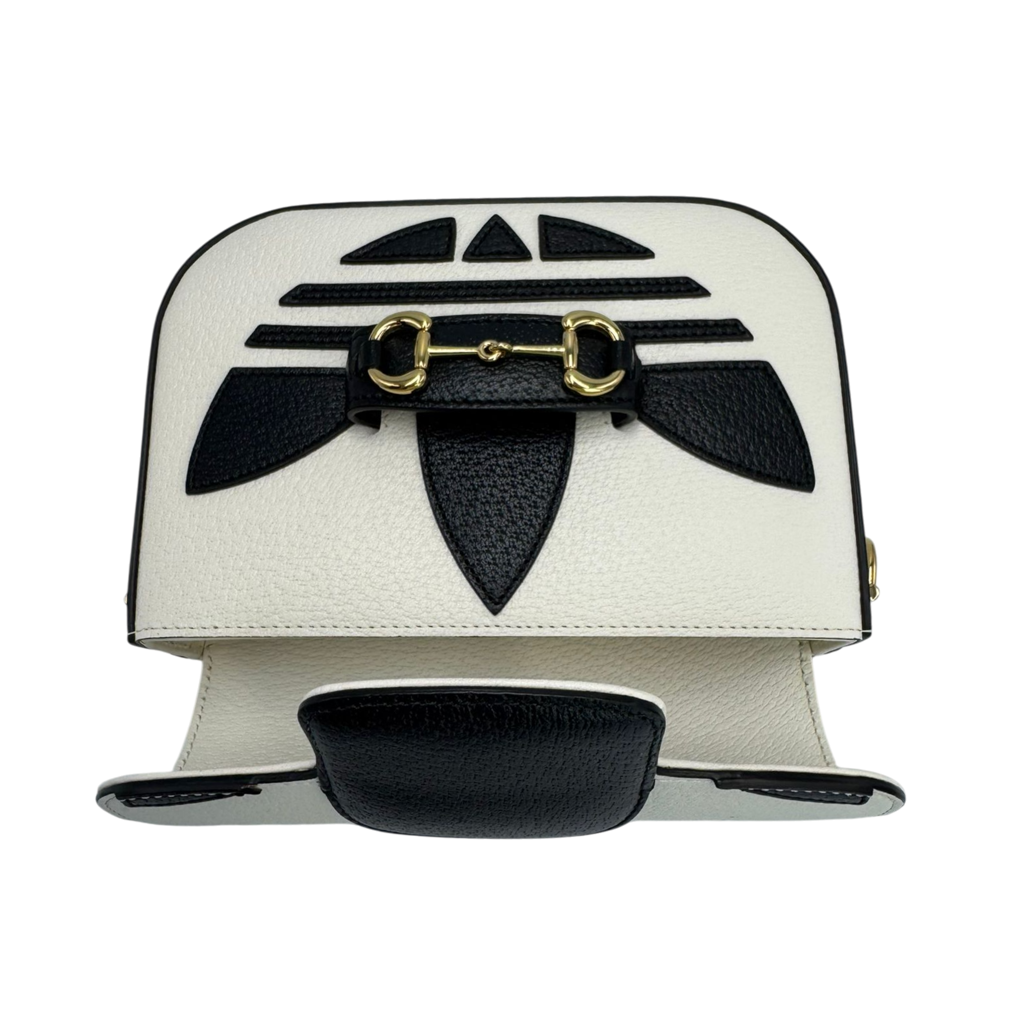 This Gucci x adidas Horsebit 1955 Mini Shoulder Bag is a real highlight from the coveted collaboration between Gucci and adidas. Crafted from white grained leather, the design is complemented by the iconic Horsebit detail, reinterpreted here with the adidas Trefoil in black leather. An exceptional combination of classic Gucci DNA and modern streetwear influence.