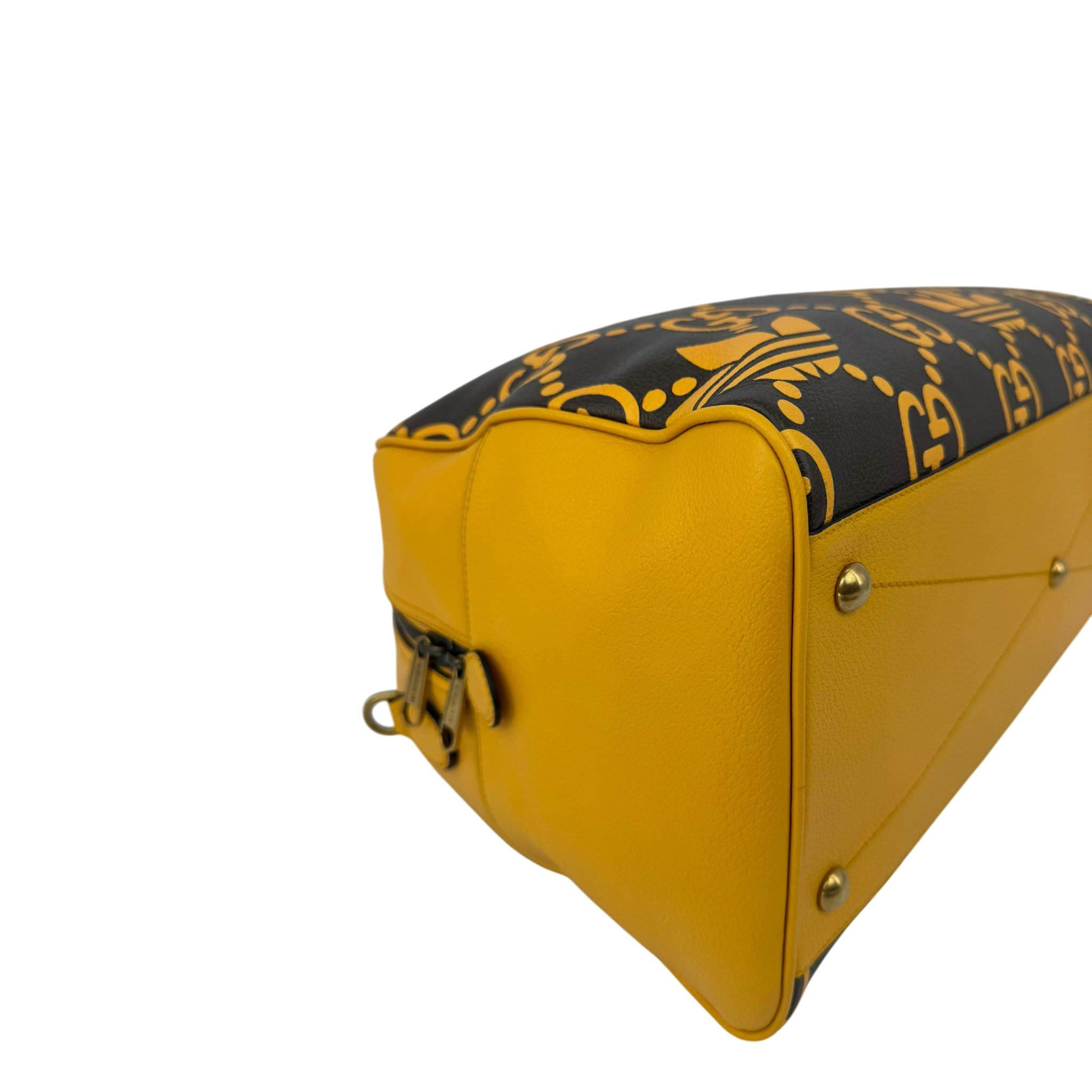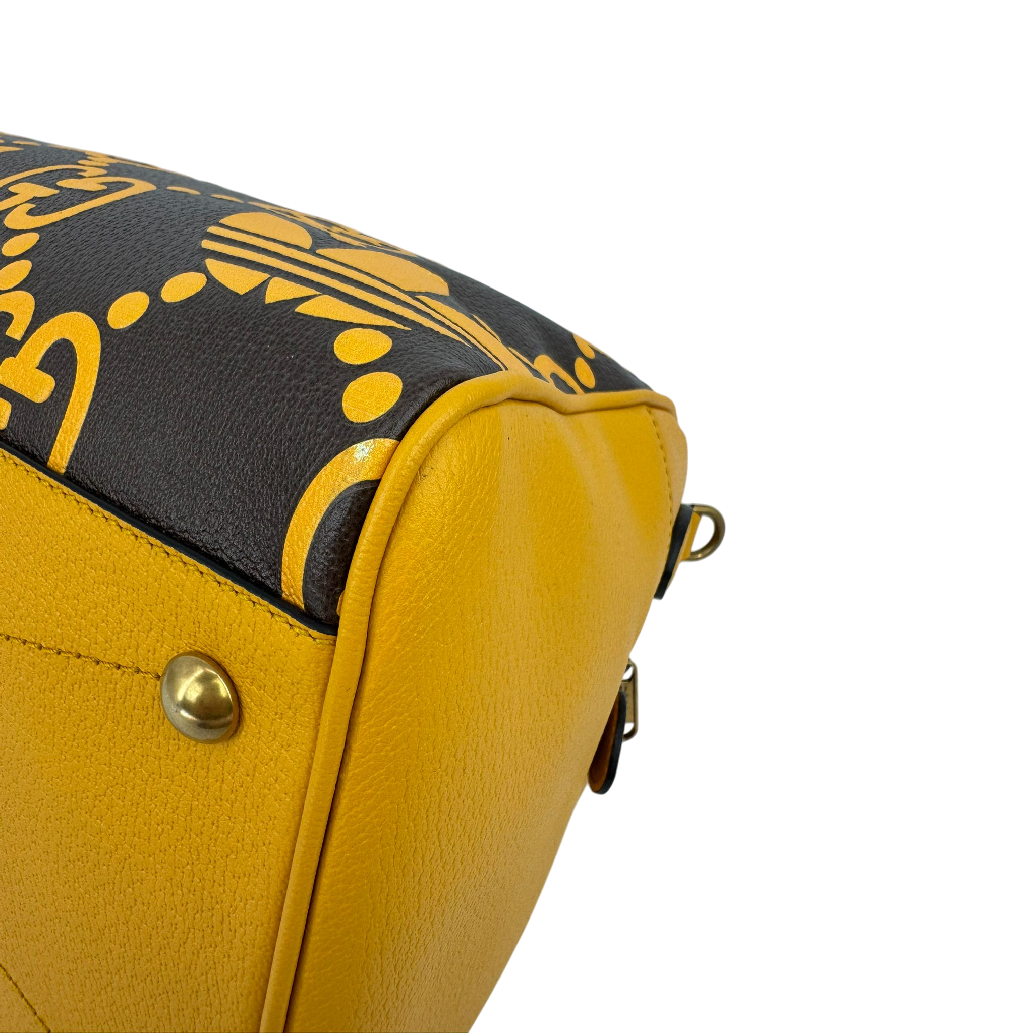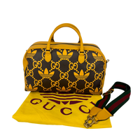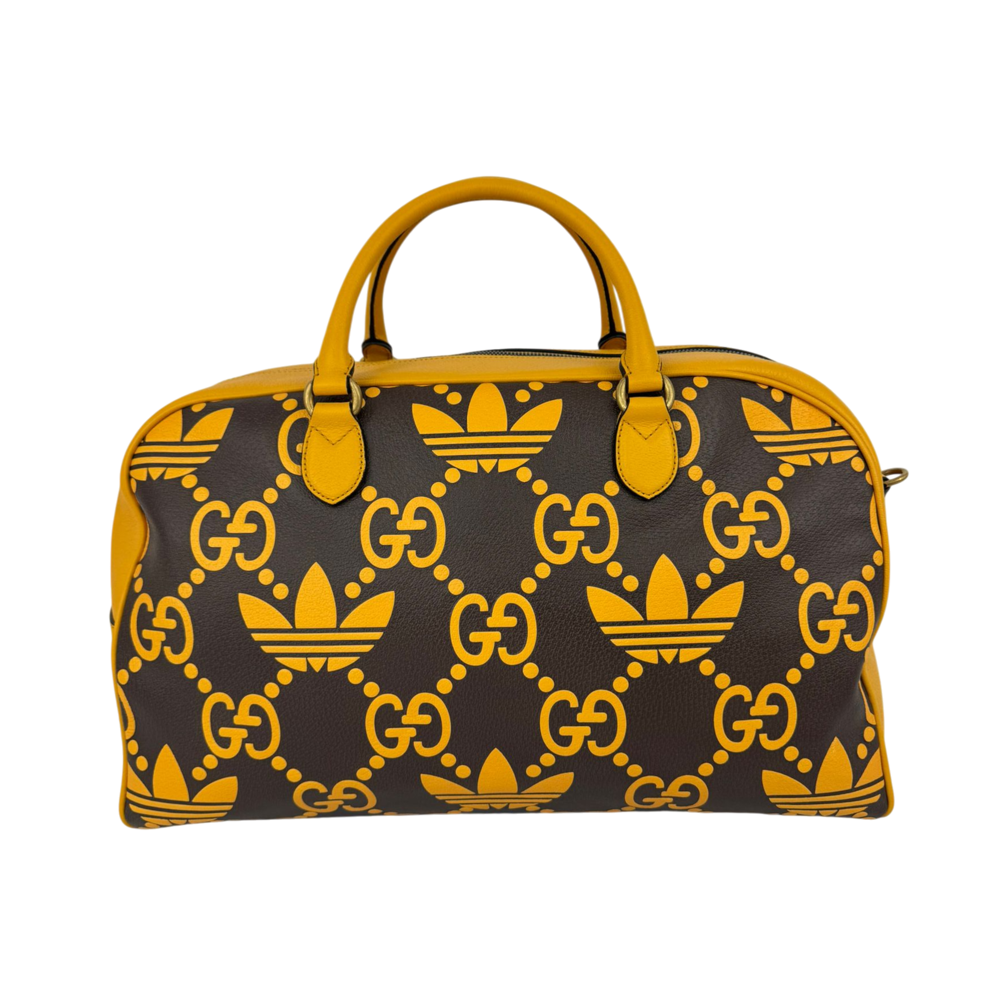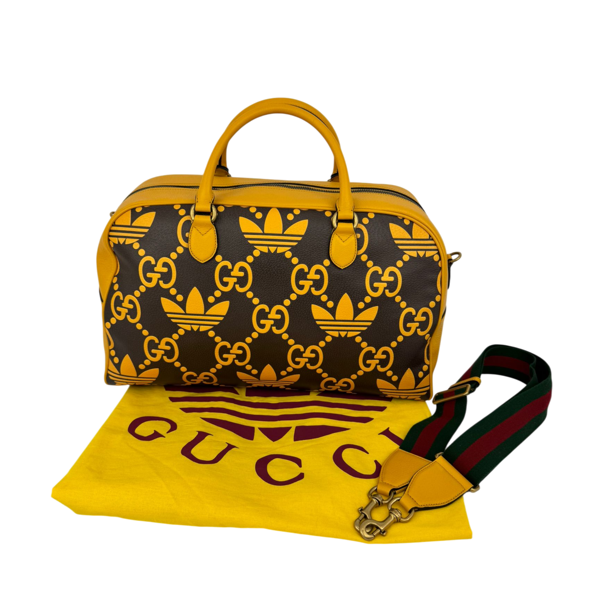 The Gucci x adidas duffle bag is the result of a limited-edition collaboration between two iconic brands and combines the classic Gucci GG Monogram with the striking adidas Trefoil details. The eye-catching play of colors in brown and yellow makes this Bag a real statement piece with high recognition value.