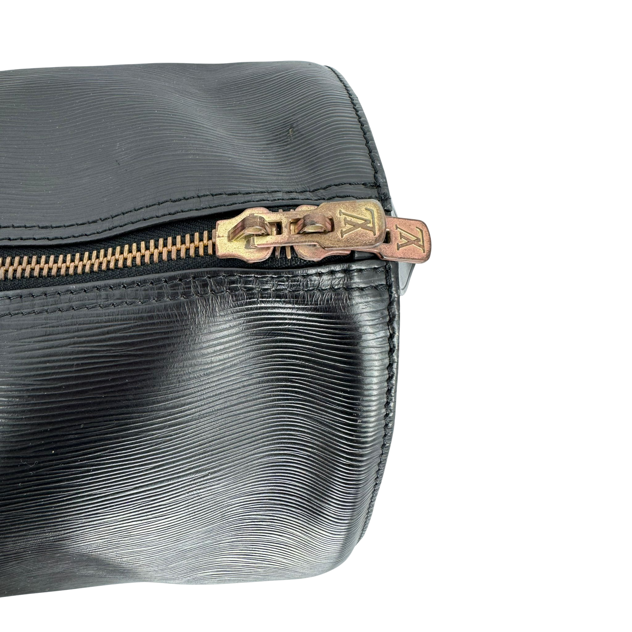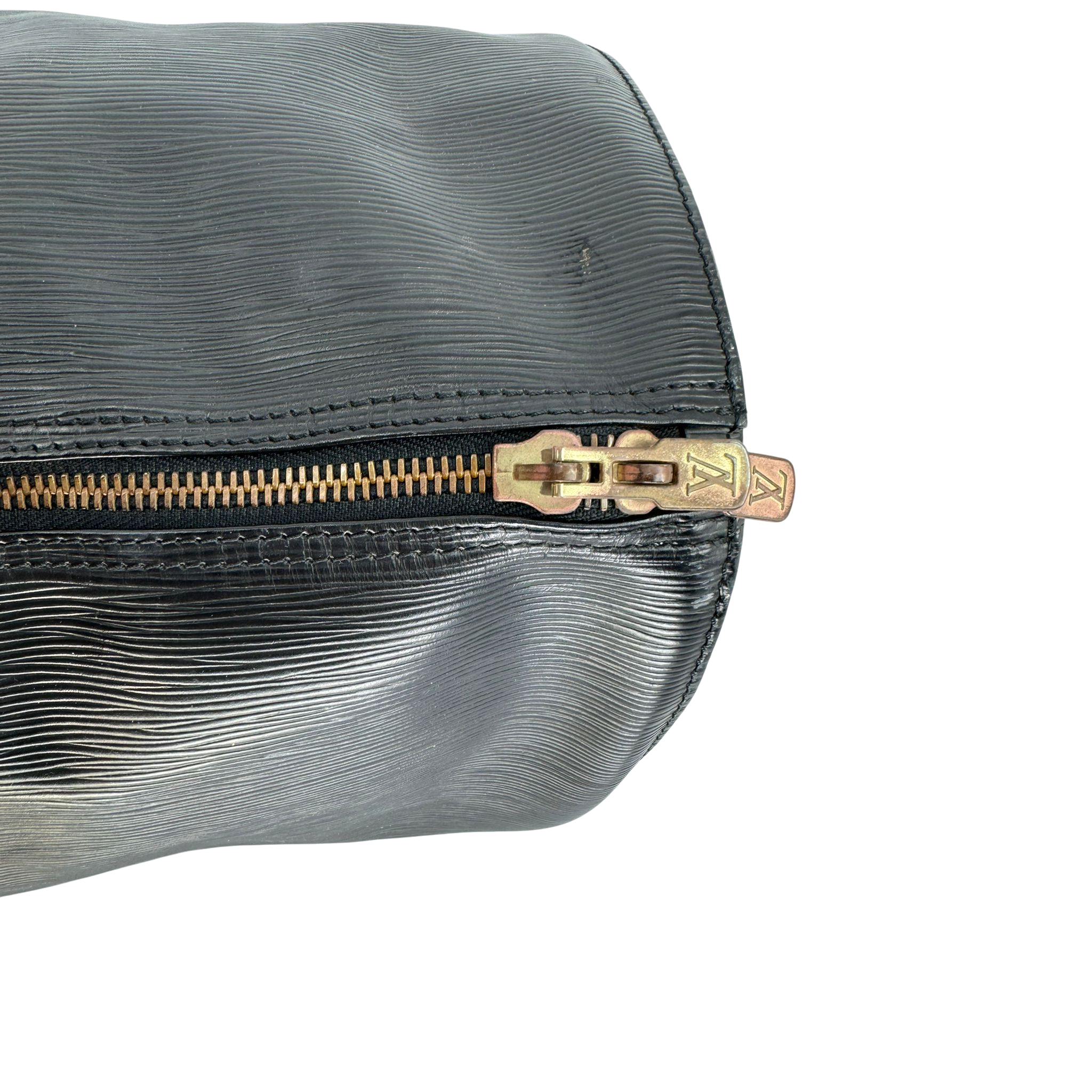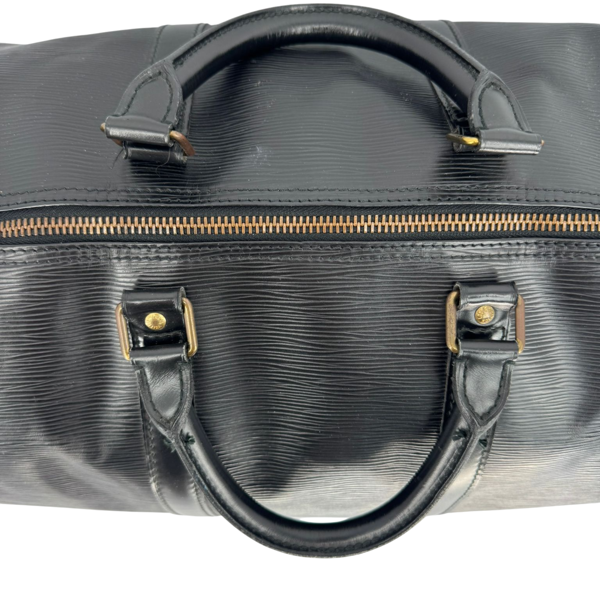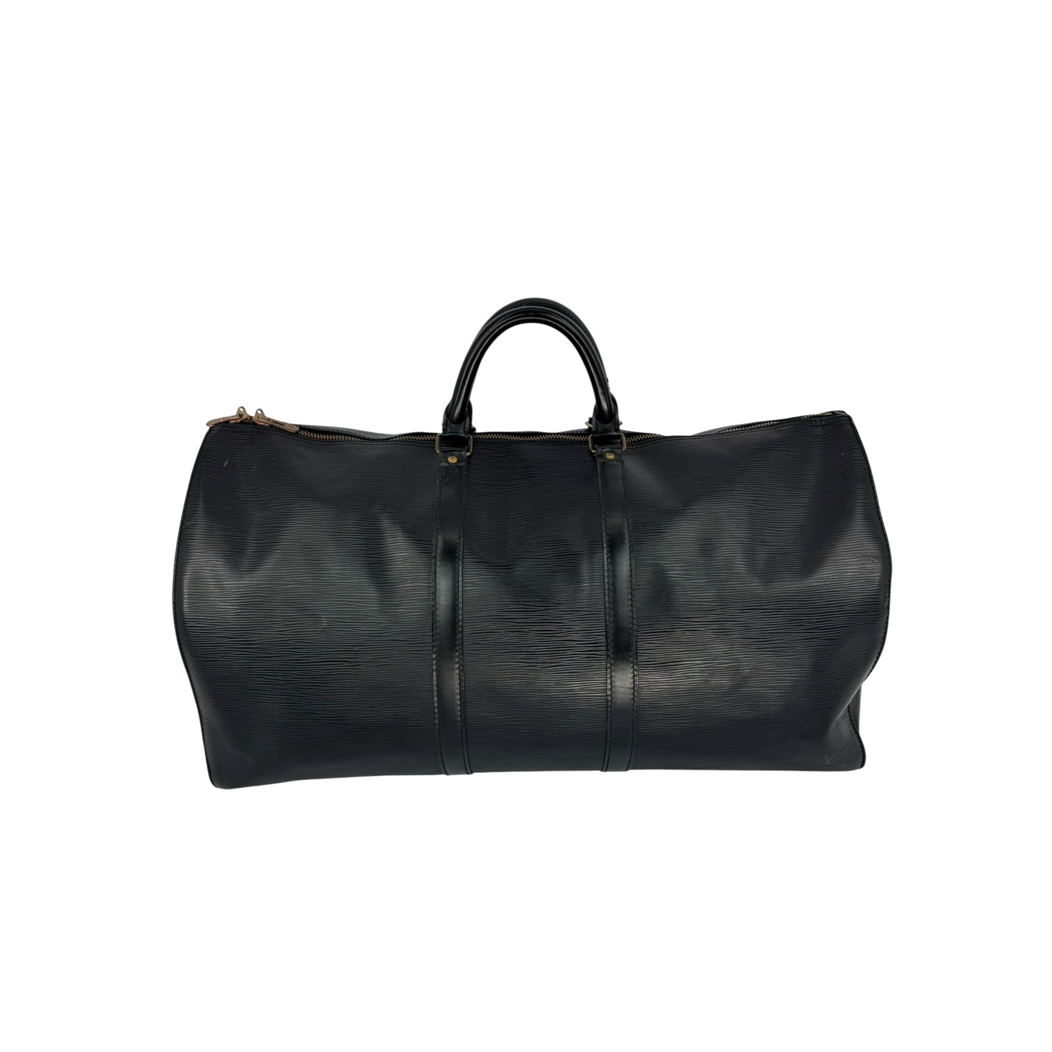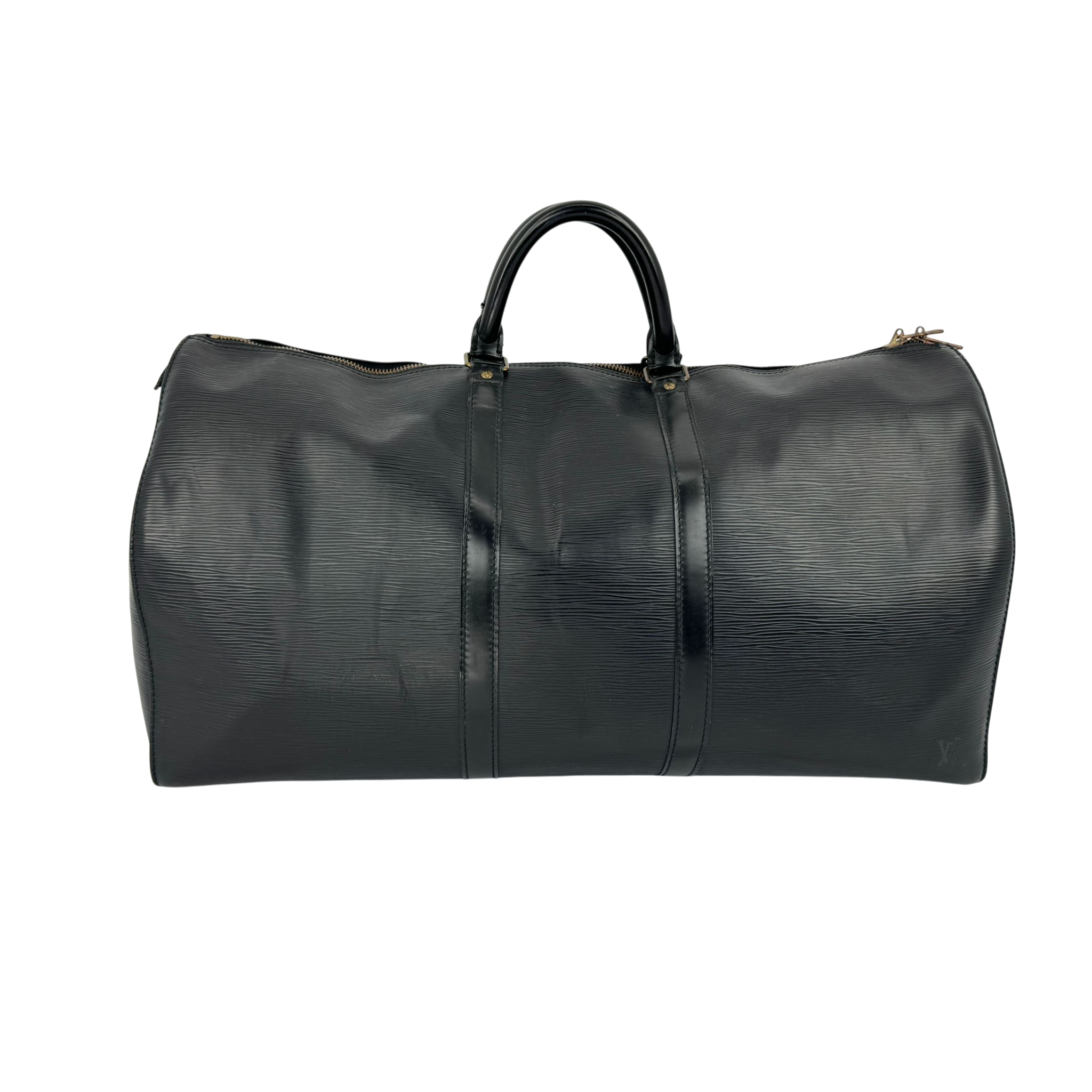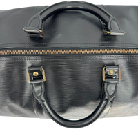 The Louis Vuitton Keepall in black Epi leather is a classic from the Louis Vuitton travel bag collection, but is no longer made in this leather. At the top, the Bag is equipped with a double zipper for secure and easy access. There is a slip pocket on one side. The handles allow the Bag to be carried comfortably in the hand. Great for any trip!