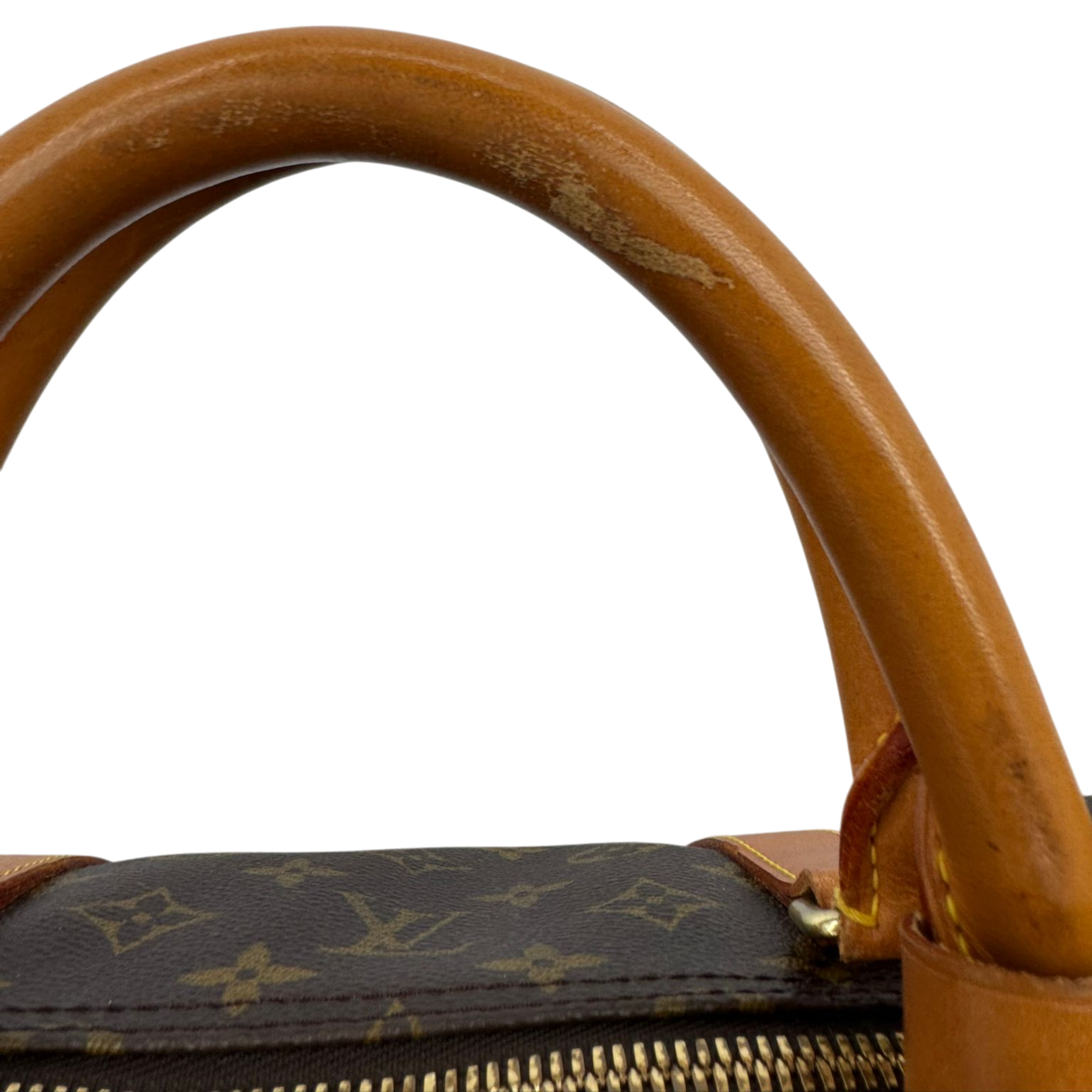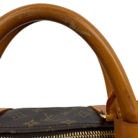 Condition: The exterior front and back show light wear and discoloration. The exterior bottom shows slight discoloration, water stains and wear. The handles have slightly darkened discoloration due to use. The hardware has light scratches and is finely chipped. The interior has slight signs of wear.