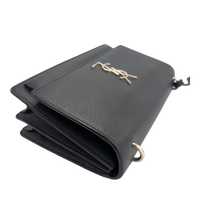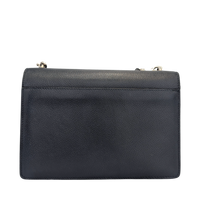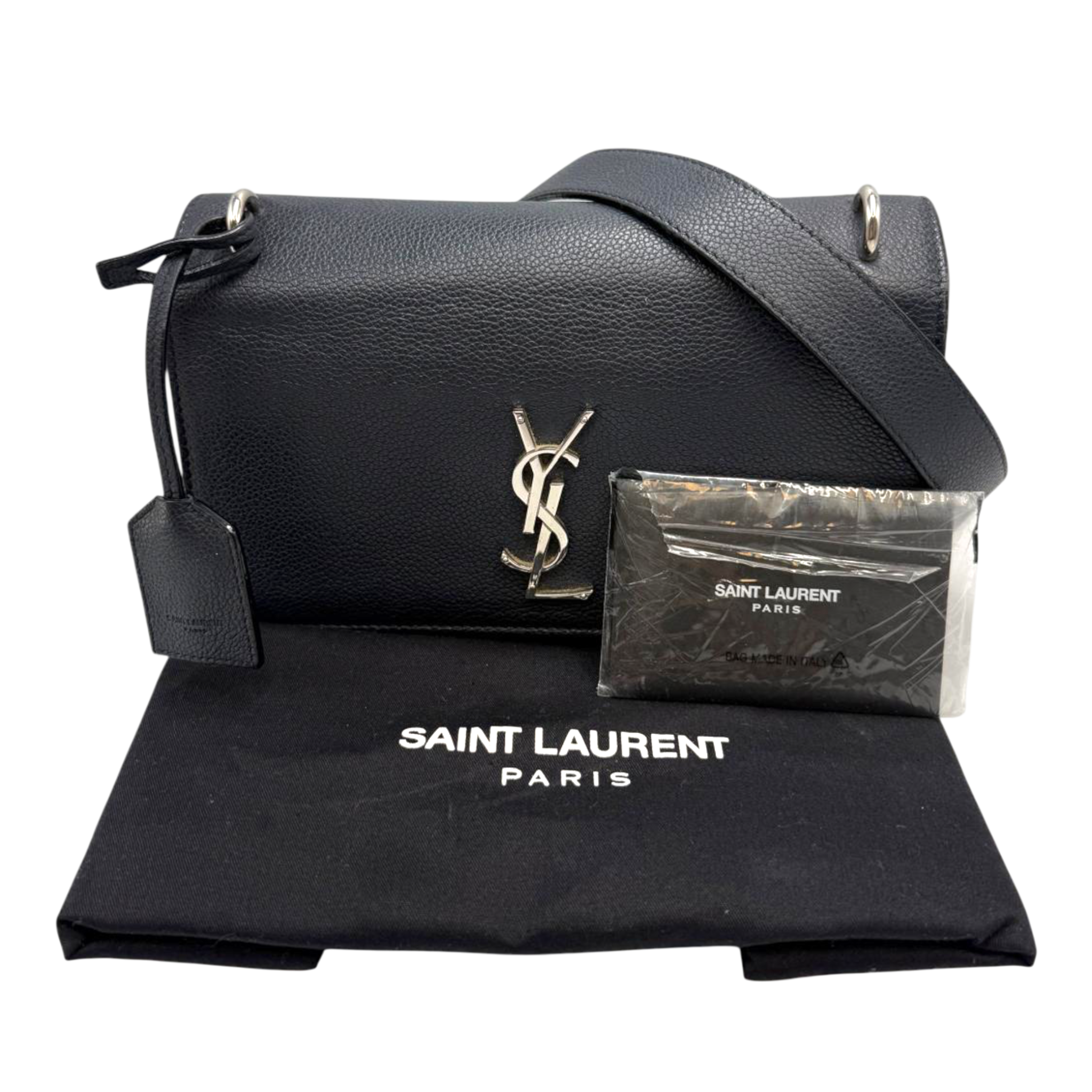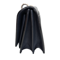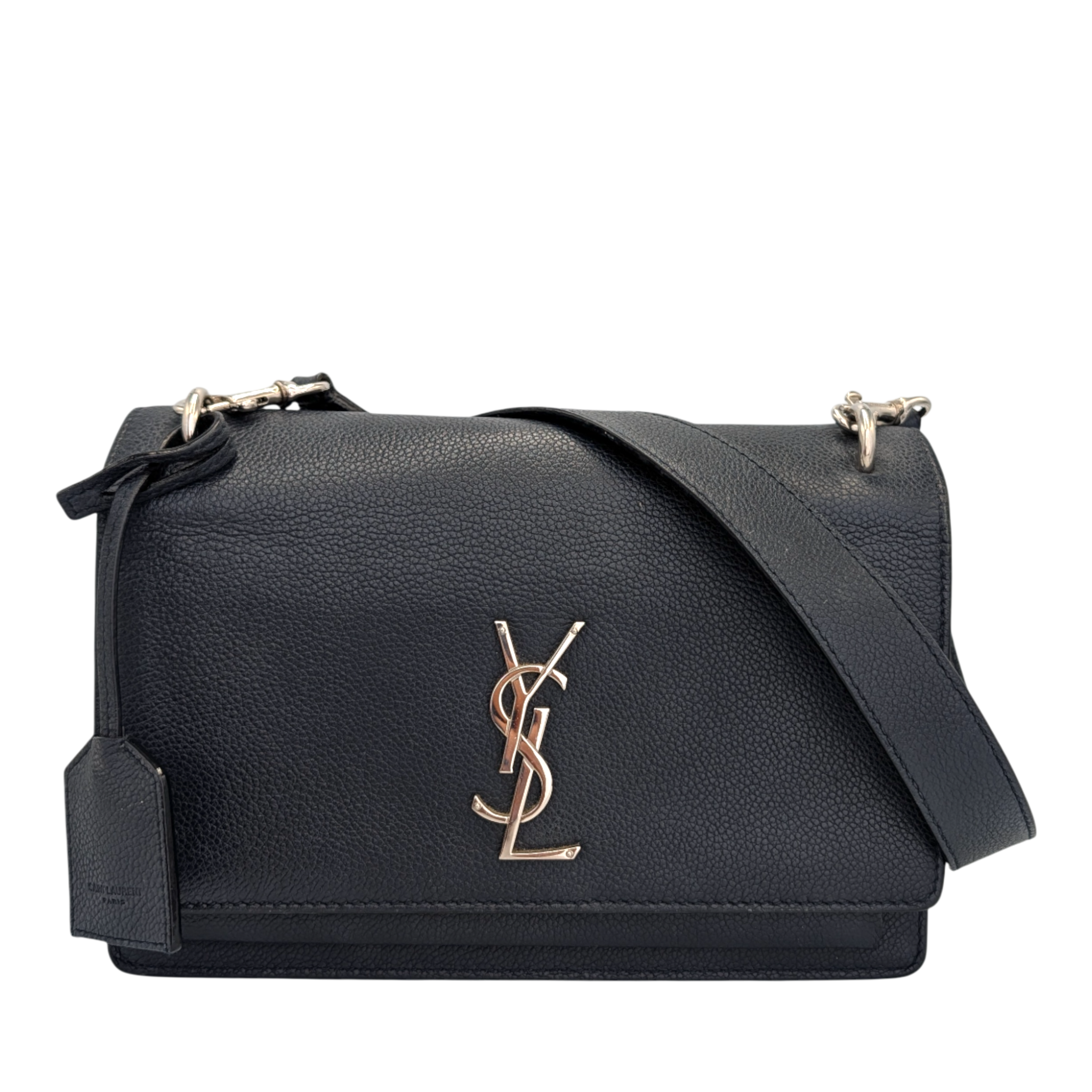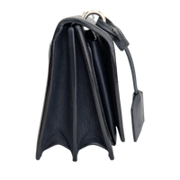 This Yves Saint Laurent Sunset is a symbol of exceptional elegance. The Bag is made of blue calfskin. The silver-colored YSL brand logo shines on the front flap of this exclusive companion, while the chain-link shoulder strap with leather protection completes the overall look. The Bag Can be worn crossbody or loosely over the shoulder. The interior is divided into two compartments, each with a slot.