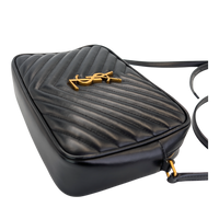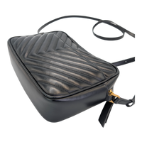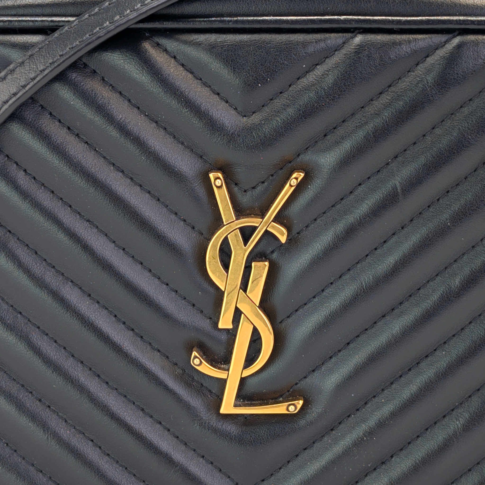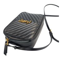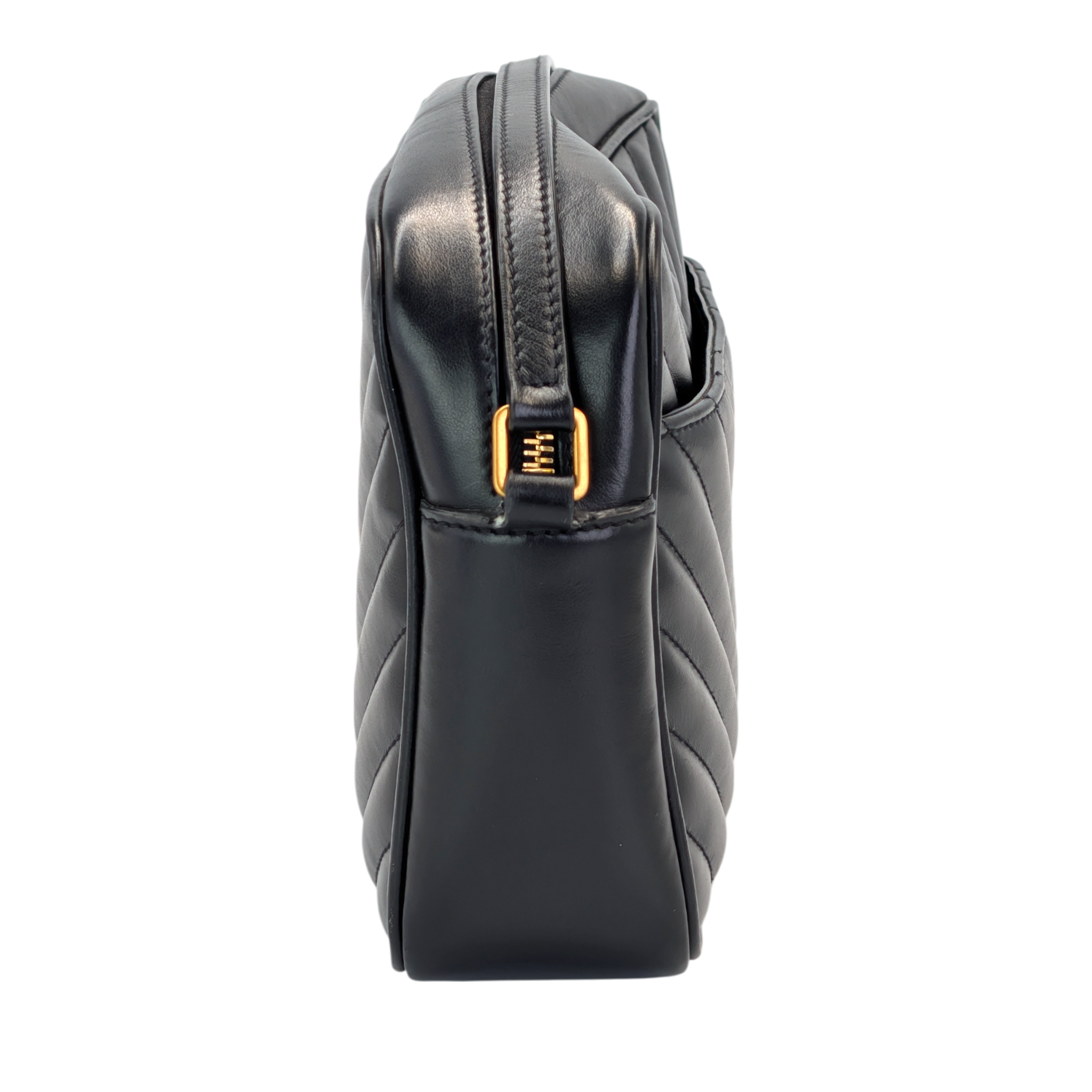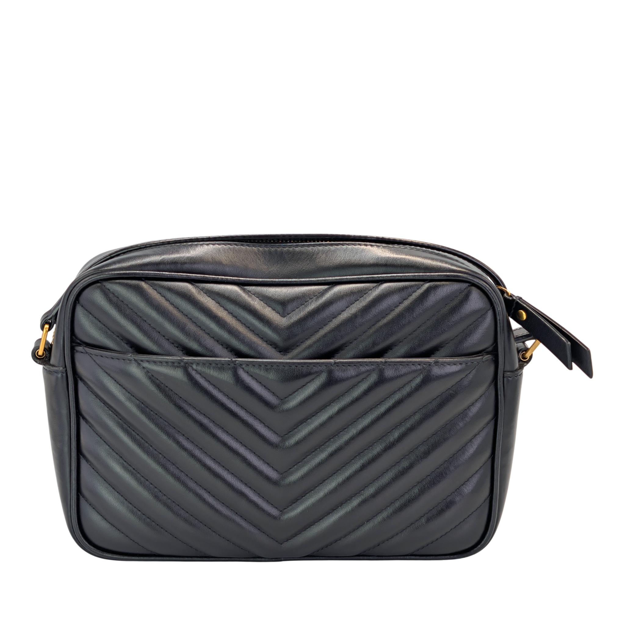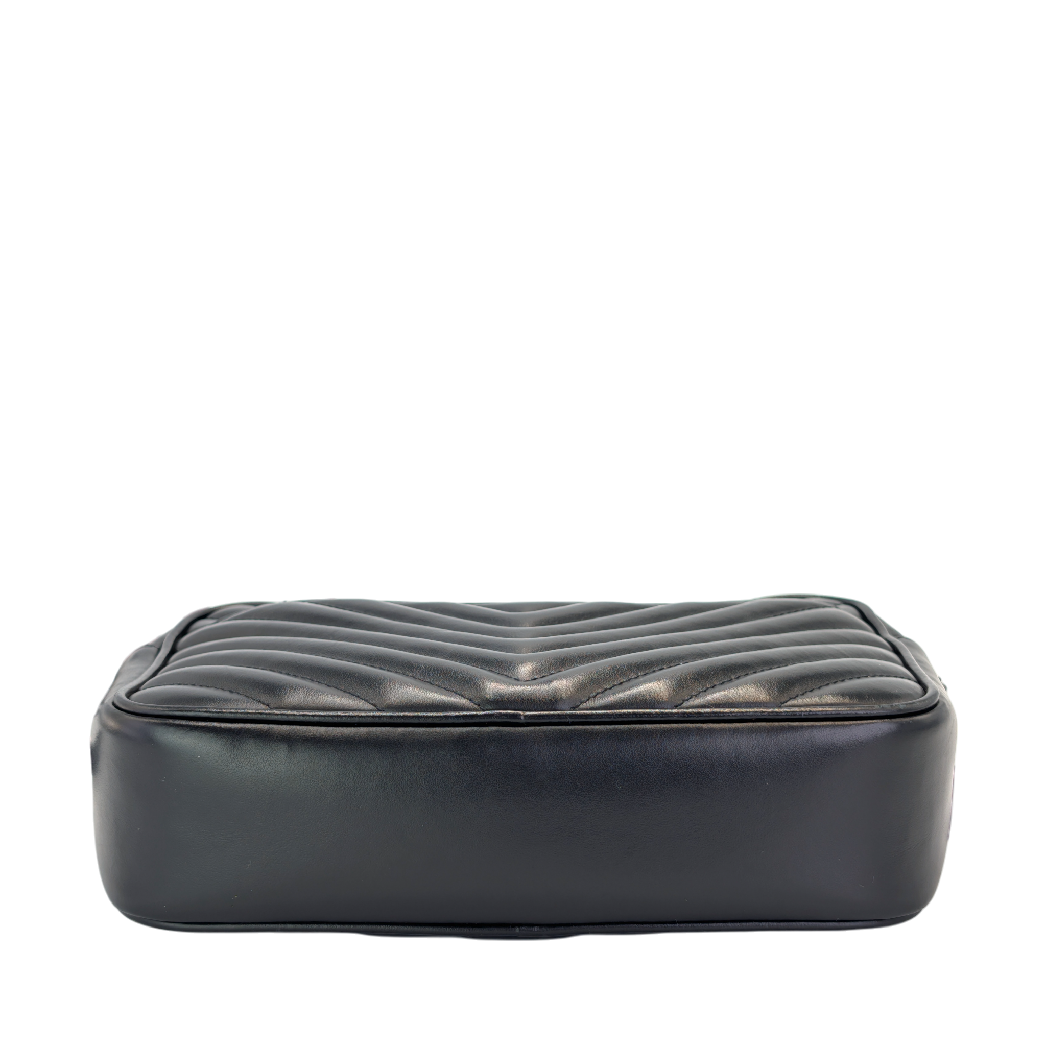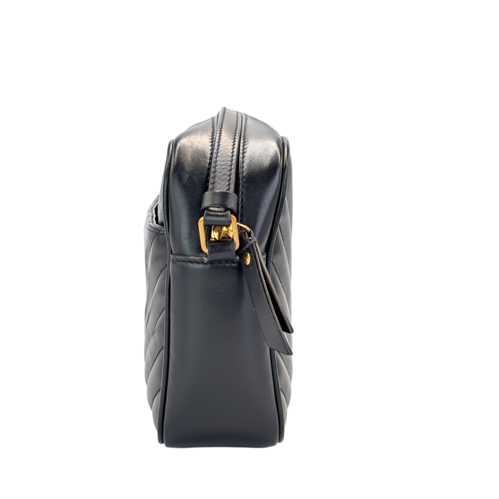 The Lou Camera Bag from Saint Laurent is made of black, quilted calfskin. It features an adjustable flat leather shoulder strap, a leather tassel and a top zip fastening.