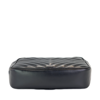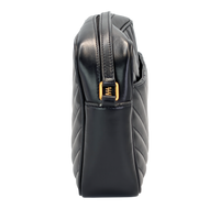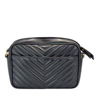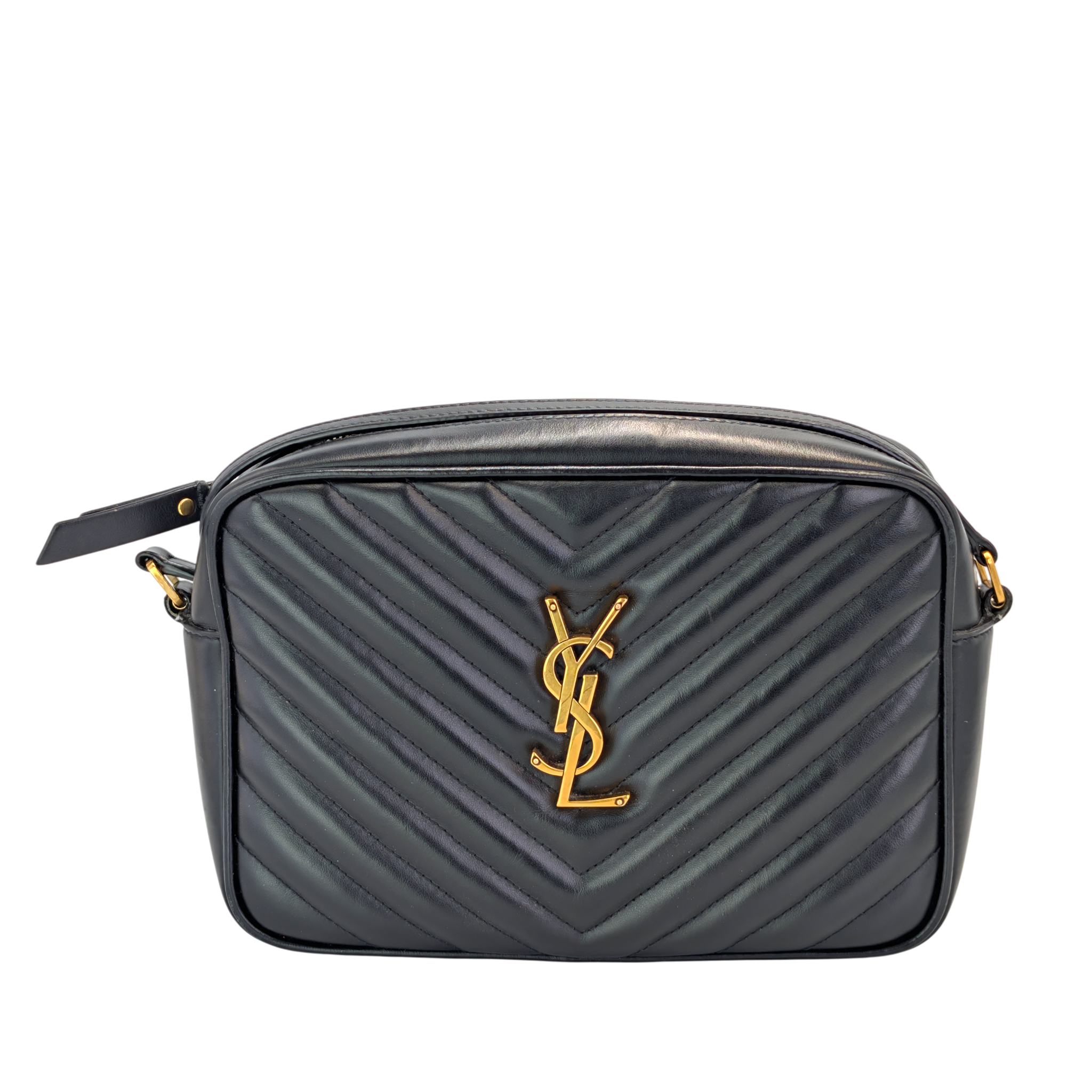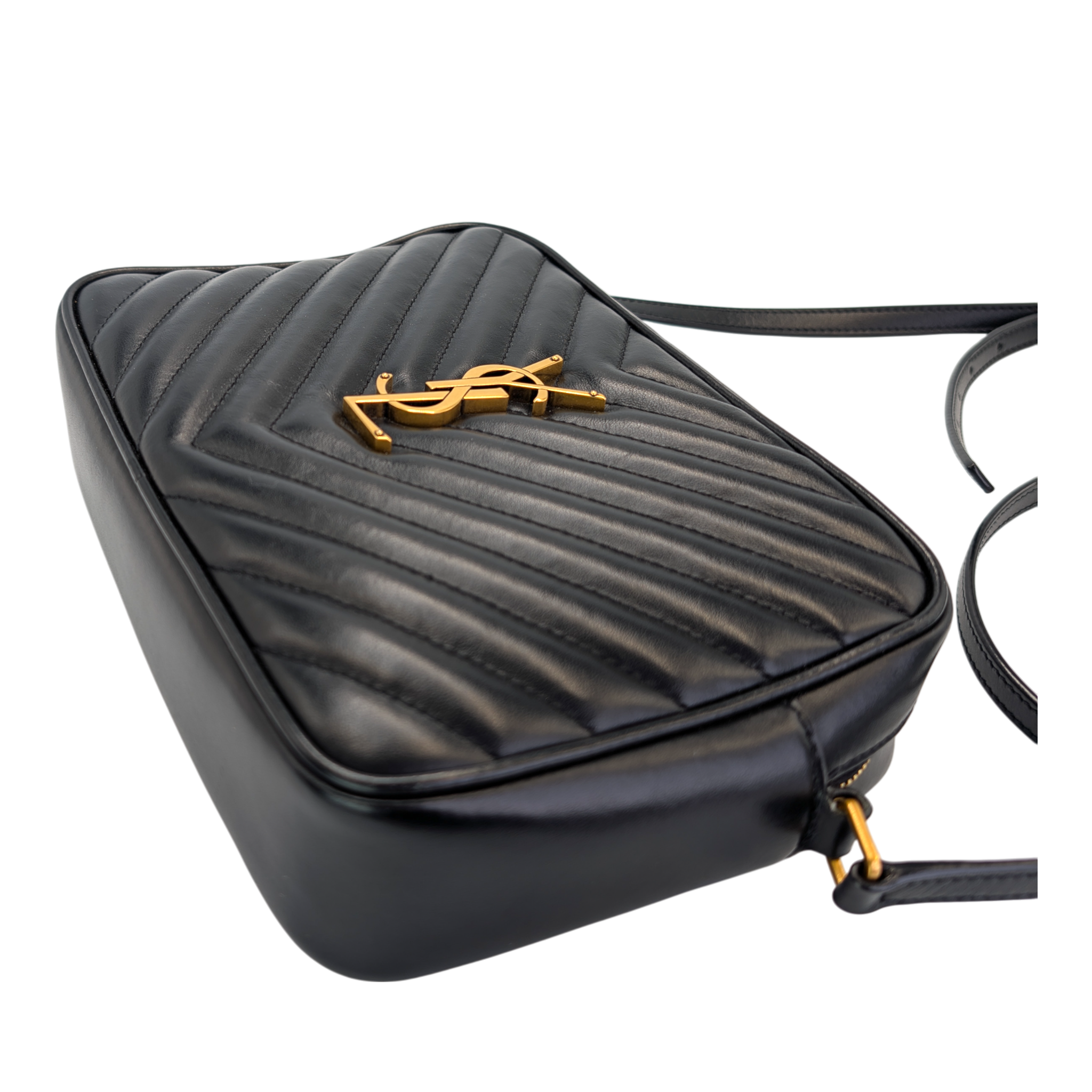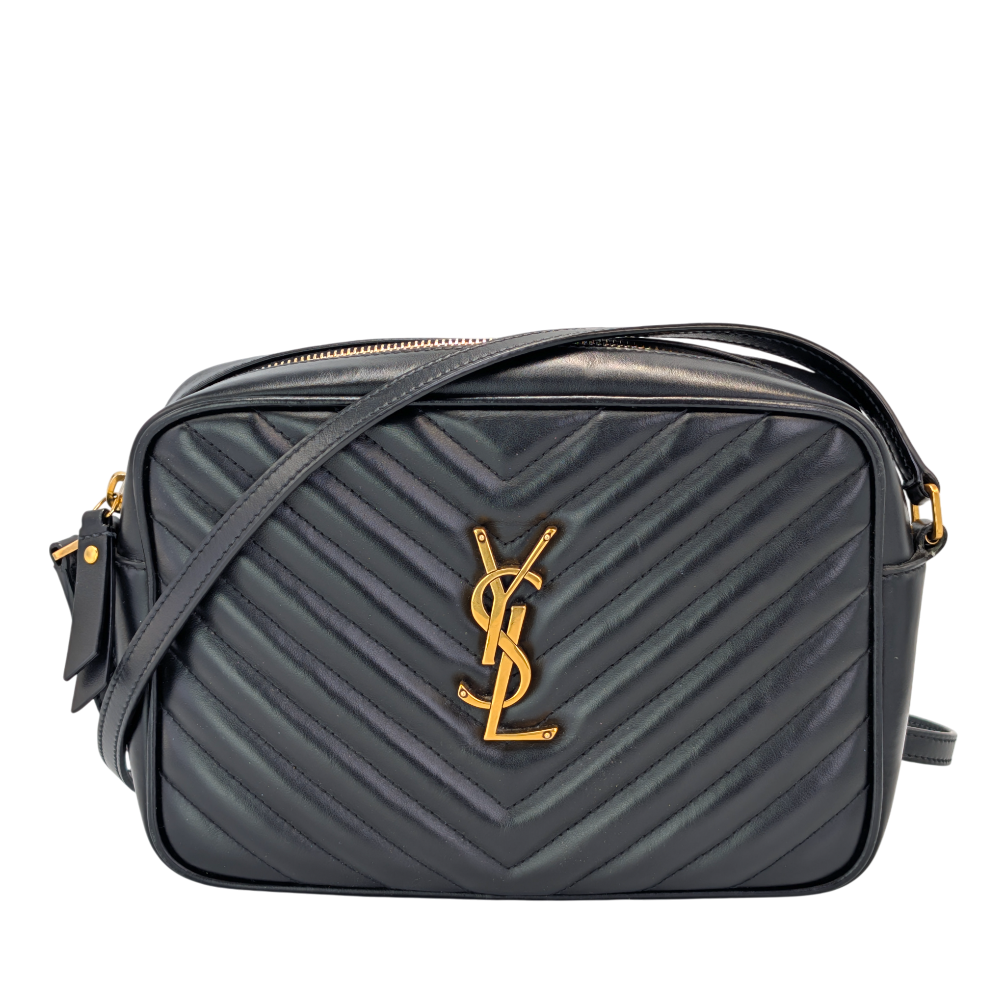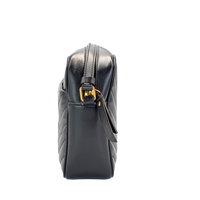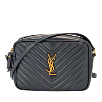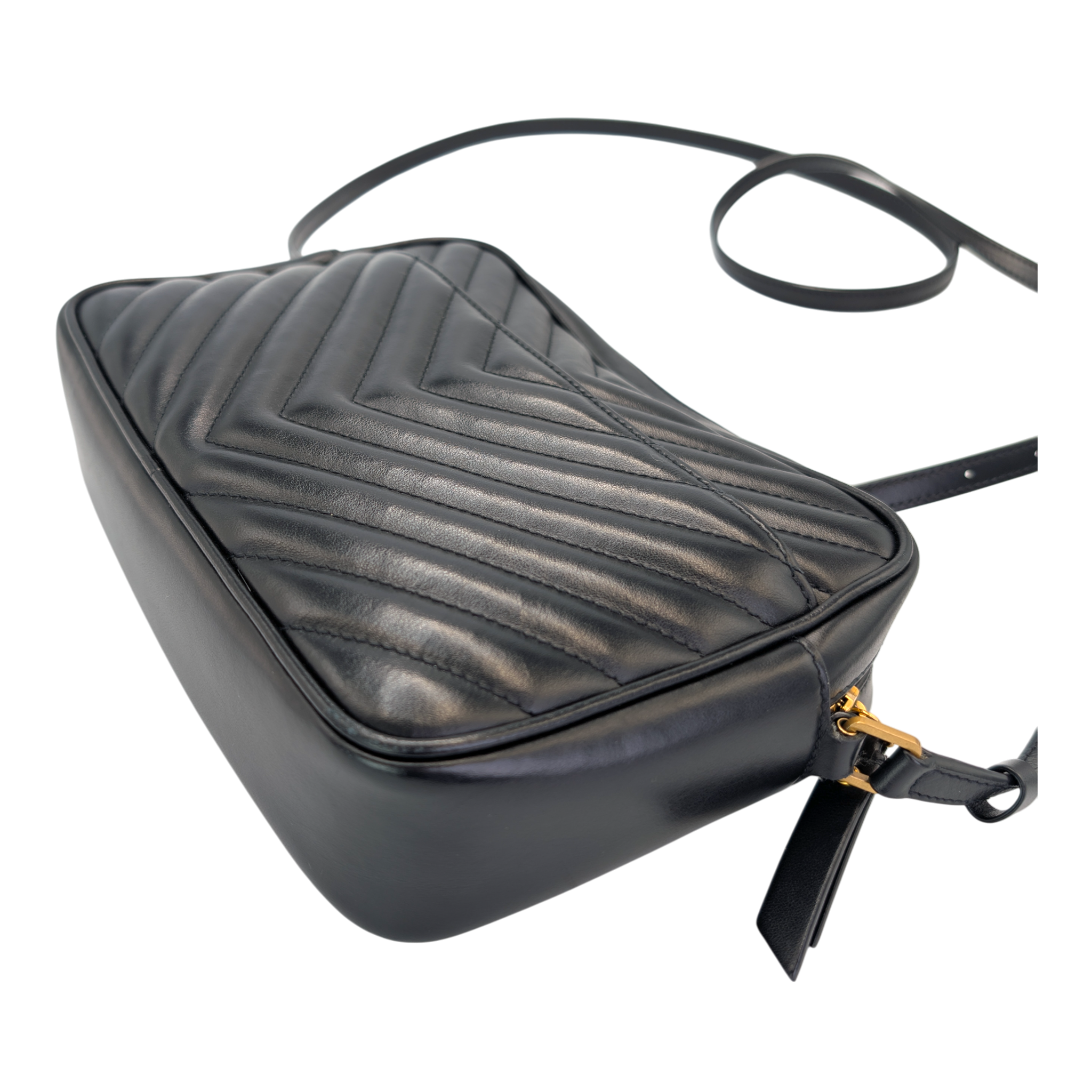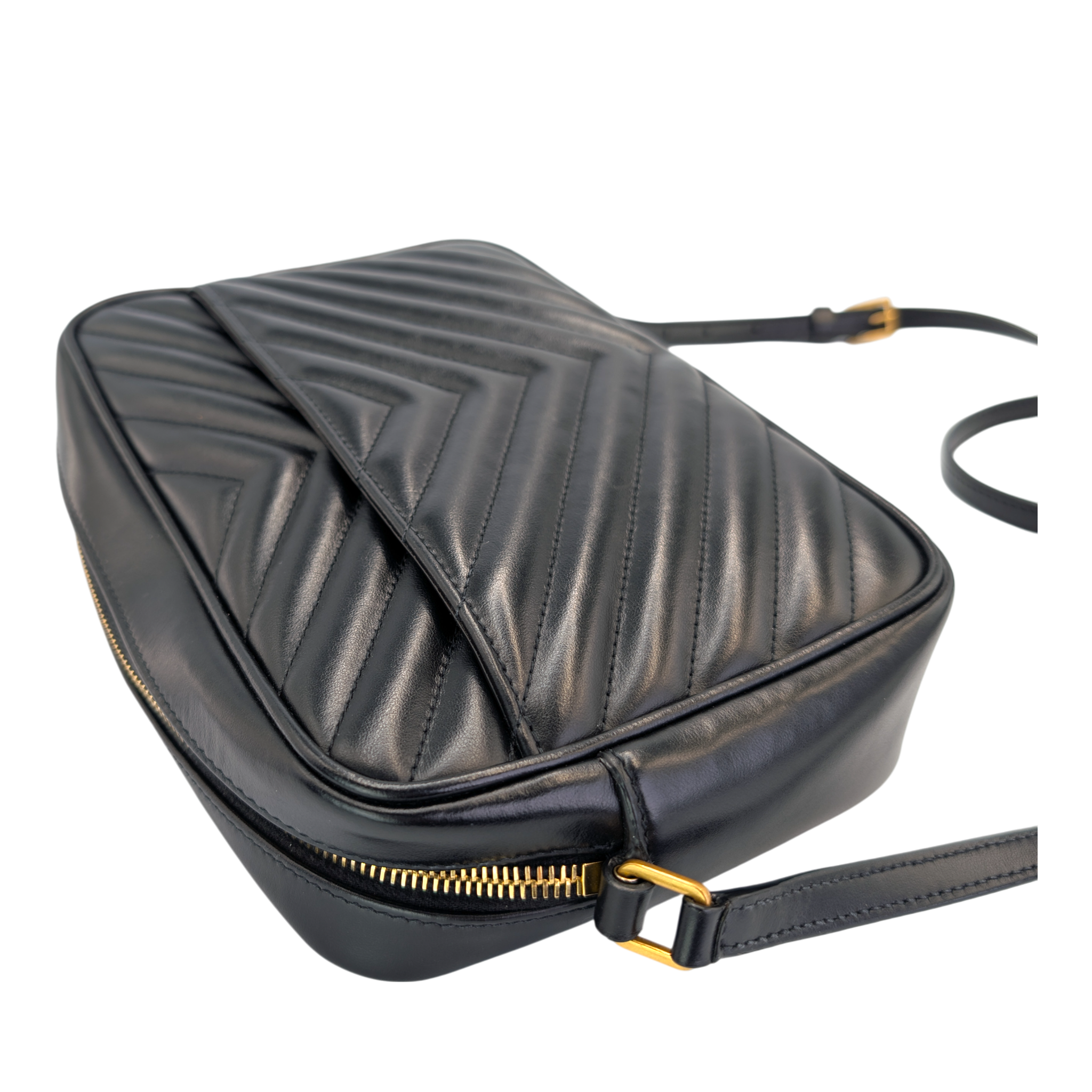 The Lou Camera Bag from Saint Laurent is made of black, quilted calfskin. It features an adjustable flat leather shoulder strap, a leather tassel and a top zip fastening.